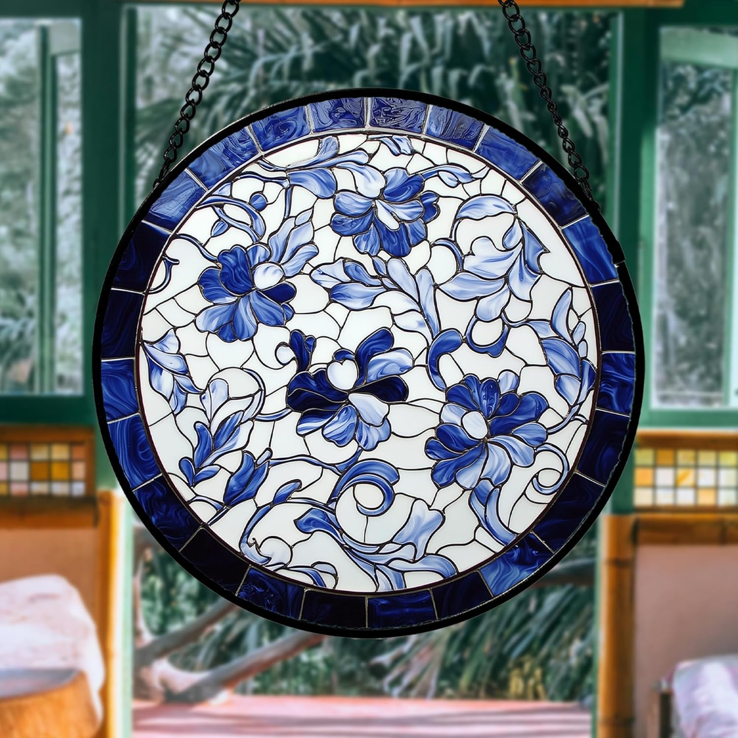 Stained Glass Window Hanging, Blue and White Abstract Flowers Sun Catcher for Door Home Decor Suncatcher Christmas Mother's Day Birthday Gifts for Women Men Mom and Nana 9.8 in