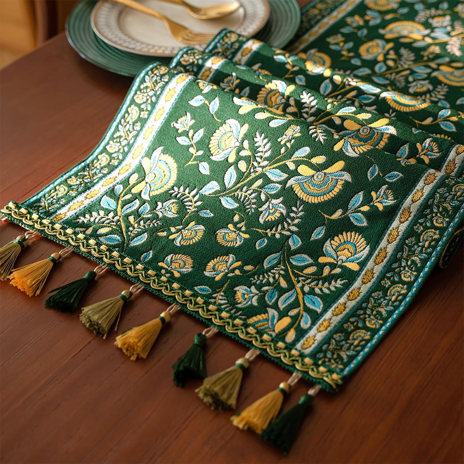 13×72 Inch Table Runner, Retro-Luxury Tassels Series for Kitchen Dining Table Holiday Decoration (Green Branch)