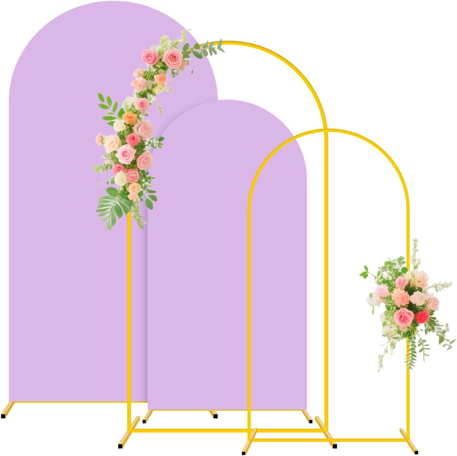 - đ„ăPackage Included - Metal Arch Backdrop Stand and Cover SetăYou will receive 2 gold metal arch backdrop stand and 2 lavender arch cover. Size: Size: 7.2ft H x 4ft W, 6ft H x 2.6ft W. Let's create unforgettable moments with our arch backdrop stand cover!