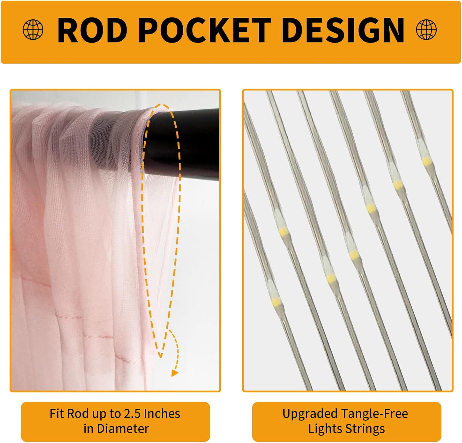 - Elegant Combination of Tulle Backdrop Curtains and Lights - Package Includes: 2 panels pink sheer tulle backdrop curtains (5ft x10ft each, total 10x10ft).1 set of a 10x10ft warm white USB-powered tangle-free string lights (10 strands with 300 LEDs). 12 Transparent clips for hassle-free Installation. (Pro Tip: Buy multiple sets for fuller coverage and reduced sheerness!)