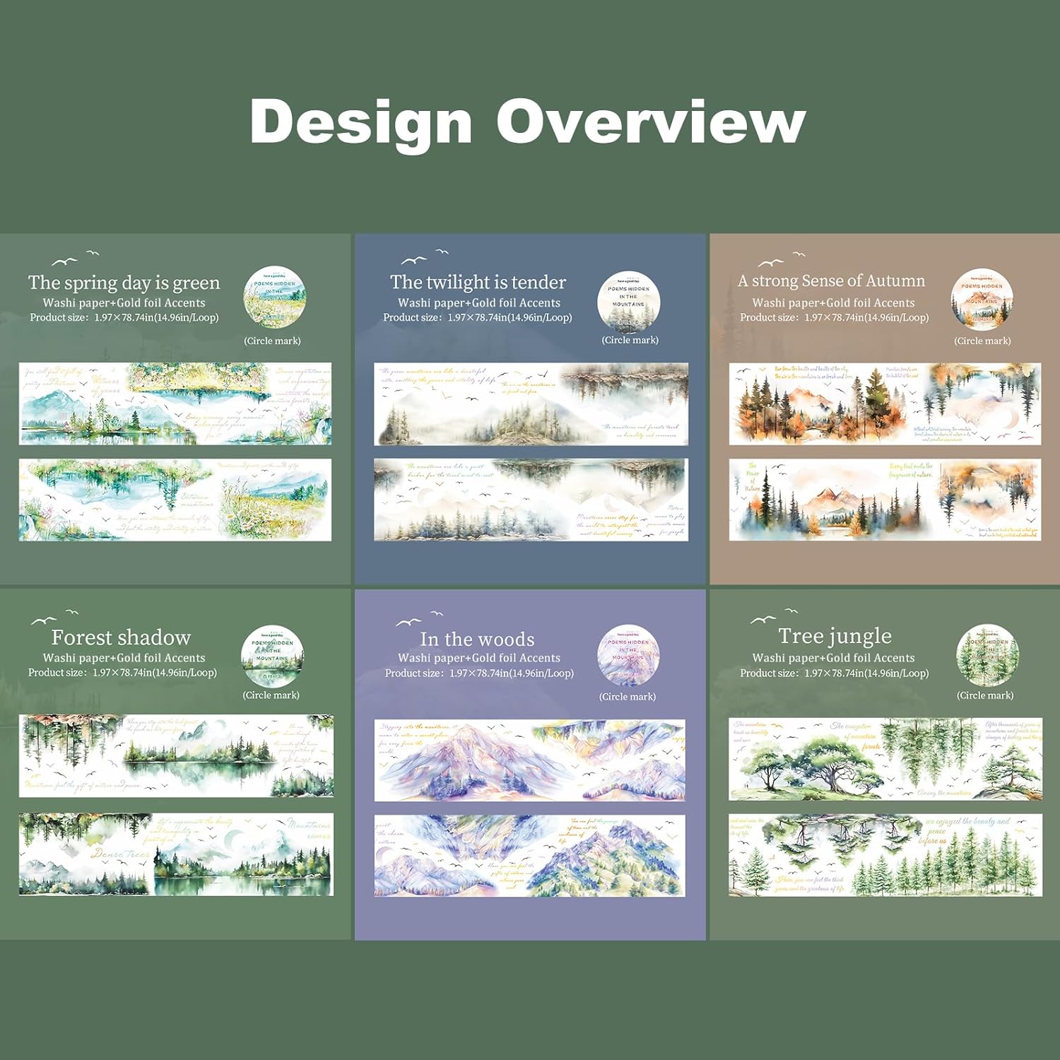 - Scenic Nature Designs: Features 6 washi rolls with poetic forest, mountain, and seasonal themes, enhanced by delicate text. Brings immersive calm and visual poetry to journals and scrapbooks