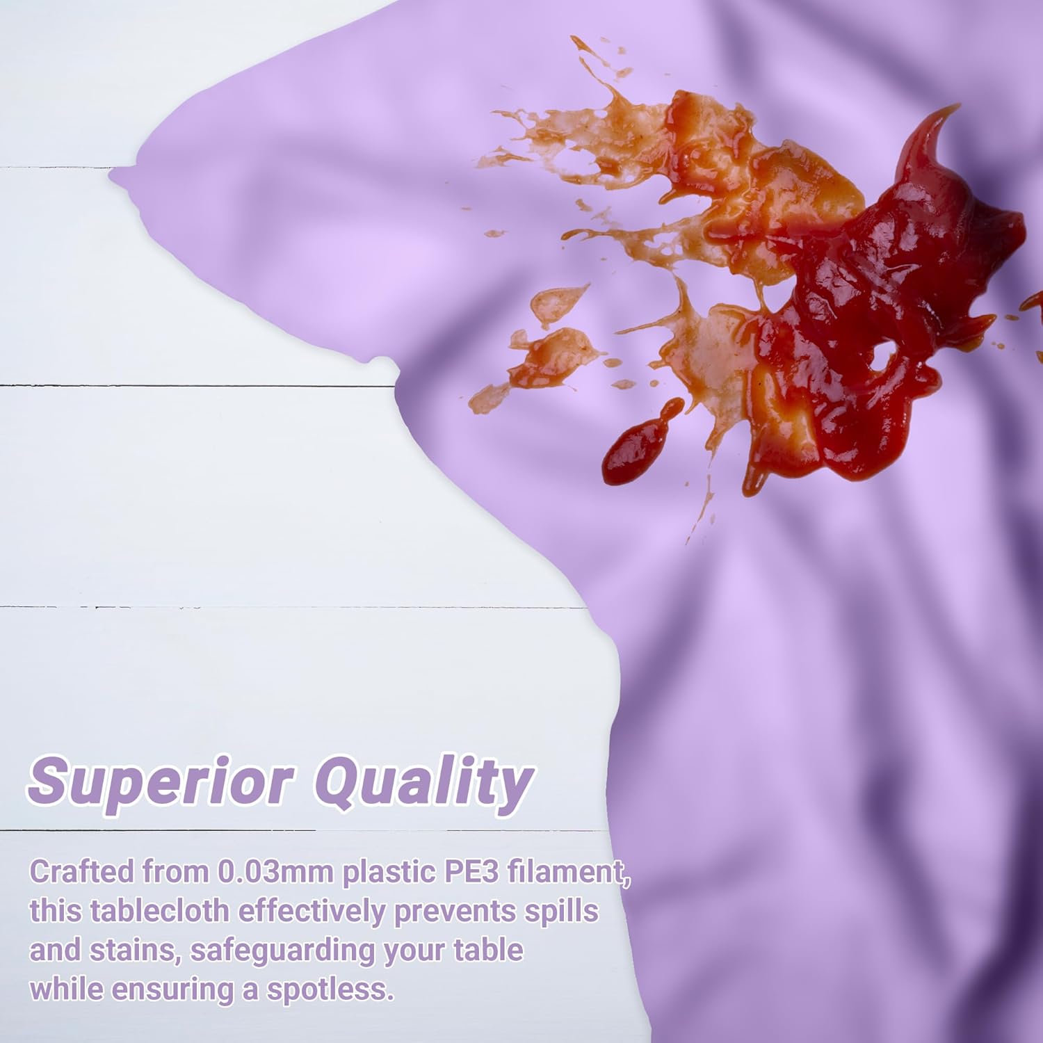 - High-End Materials: Crafted from 0.03mm premium PE3 plastic, this lavender tablecloth is designed to protect against spills, stains, and grease, making it perfect for vibrant events. The oil-resistant surface repels messes, while the excellent material of our table cloth ensures stability during adjustments, guaranteeing flawless coverage for events such as outdoor gatherings, and wedding decorations for tables.