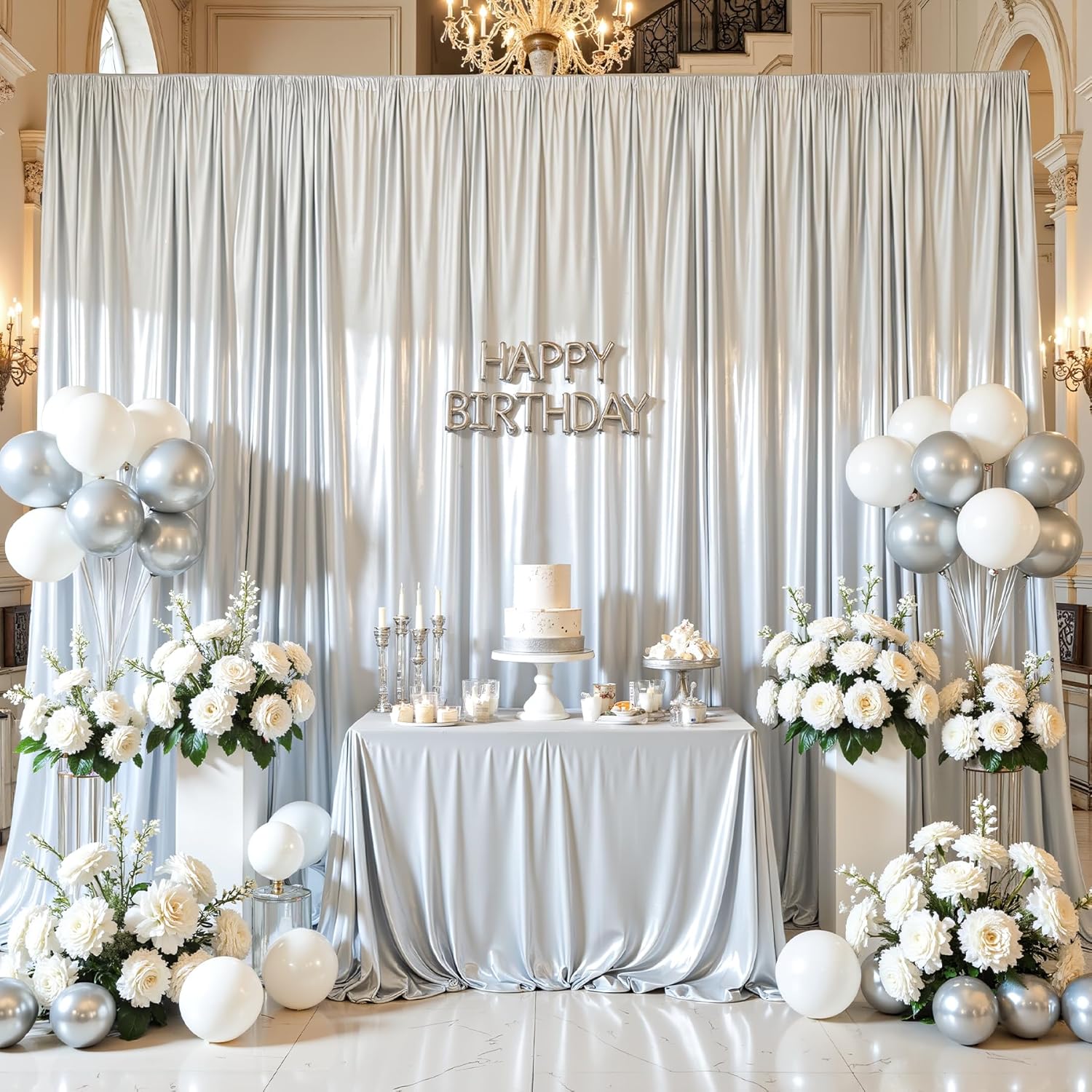 - Silver Backdrop Panel Package Included & Easy to Install:The package included 2 Panels 5x10ft backdrop curtain,which can be arranged side by side to create a 10x10ft backdrop or used separately.Install way: Insert a rod or hang it on walls, ceilings, or temporary frames.