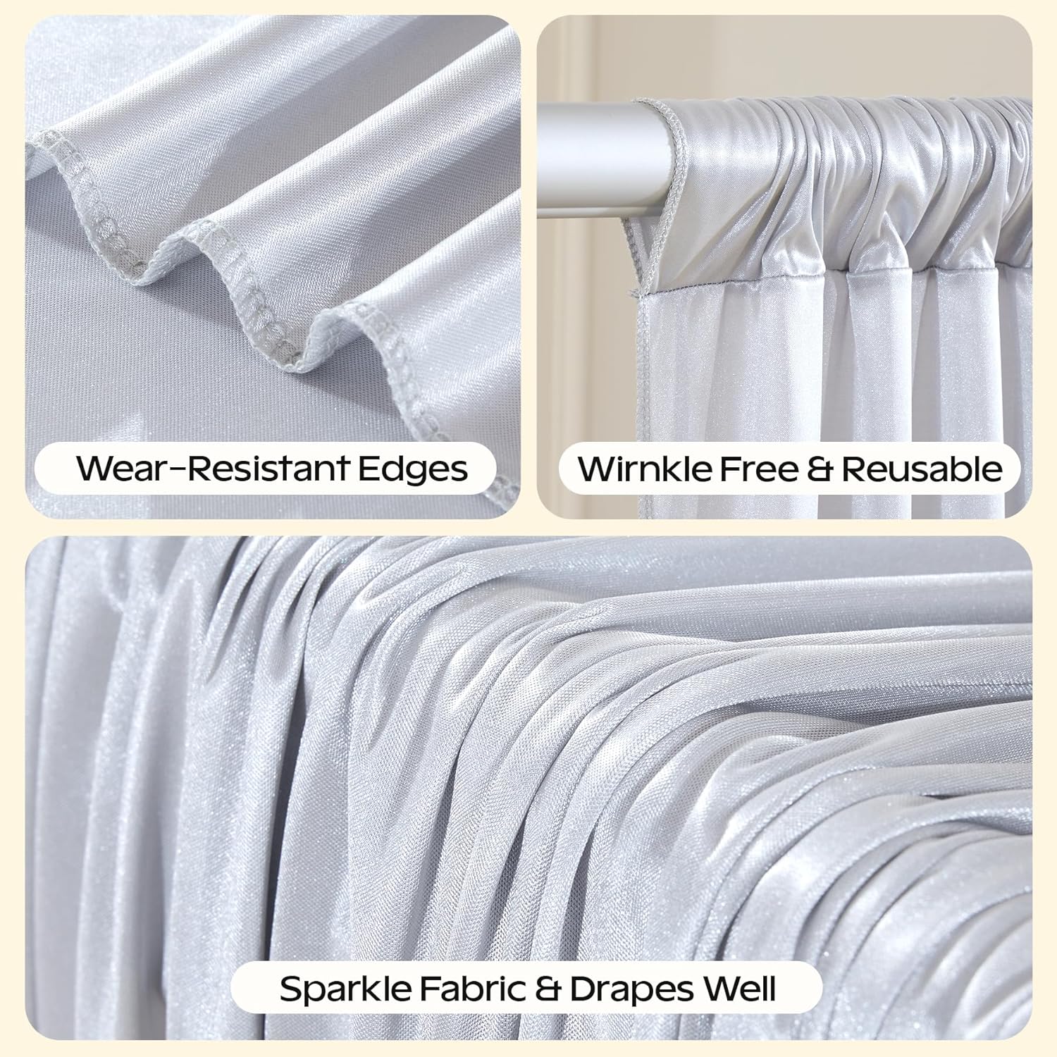 - Shimmer Silver Backdrop Anti-wrinkle:This wedding glitter backdrop curtain made of luminous fabric,it is thick and well-made,the fabric is very smooth and drapes fantastically.it could added some elegance to a event. The material can keeping the natural droop when falls on the floor to perfect for various theme events.