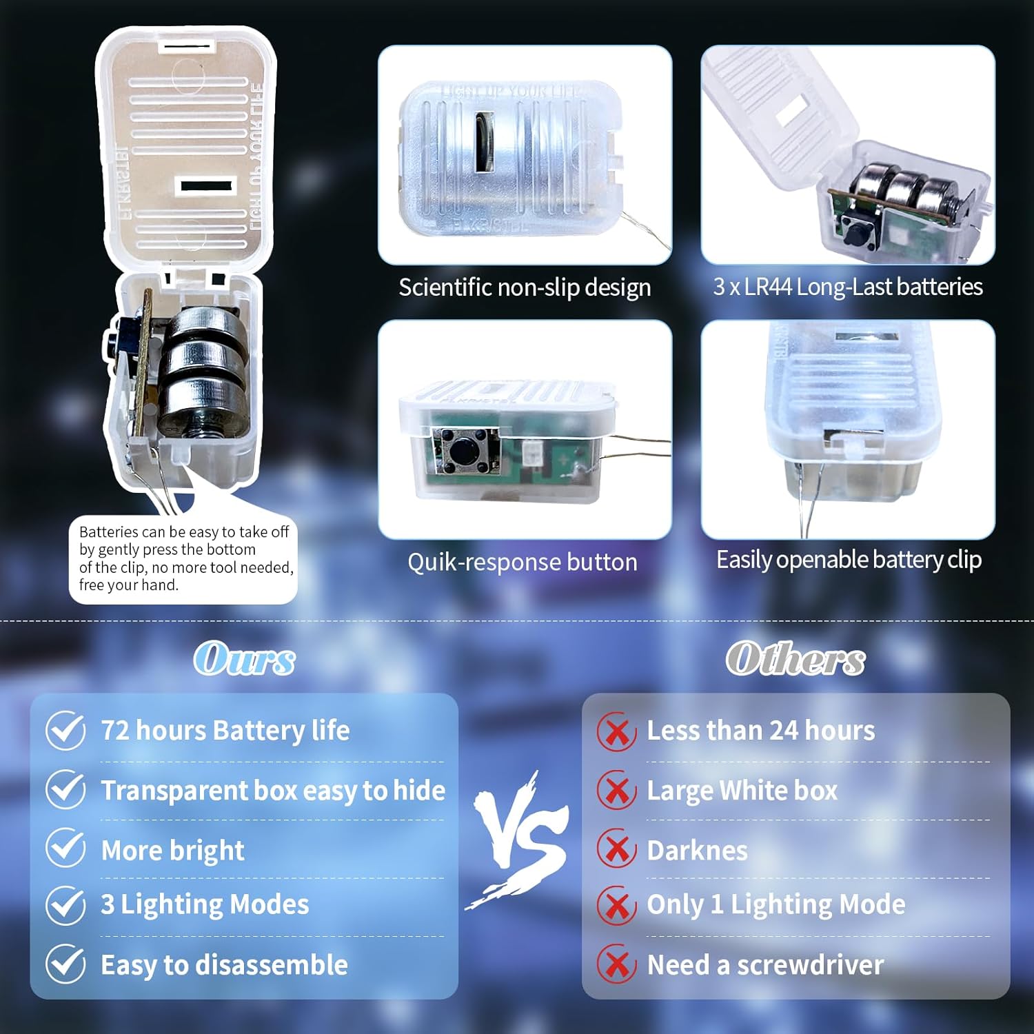 - PREMIUM QUALITY AND LONG LAST LIFE: 12 pack in a box, each twinkle lights made of high quality durable 7 feet long flexible silver wire, and 20 energy-efficient mini led fairy lights, 4 inch distance between each led moon lights. This fairy lights battery operated by 3 x LR44 batteries (included), which can provide 101 hours life. This Christmas lights is perfect for both everyday decorations as well as holiday decor (Batteries need to be replaced when the string get dims)