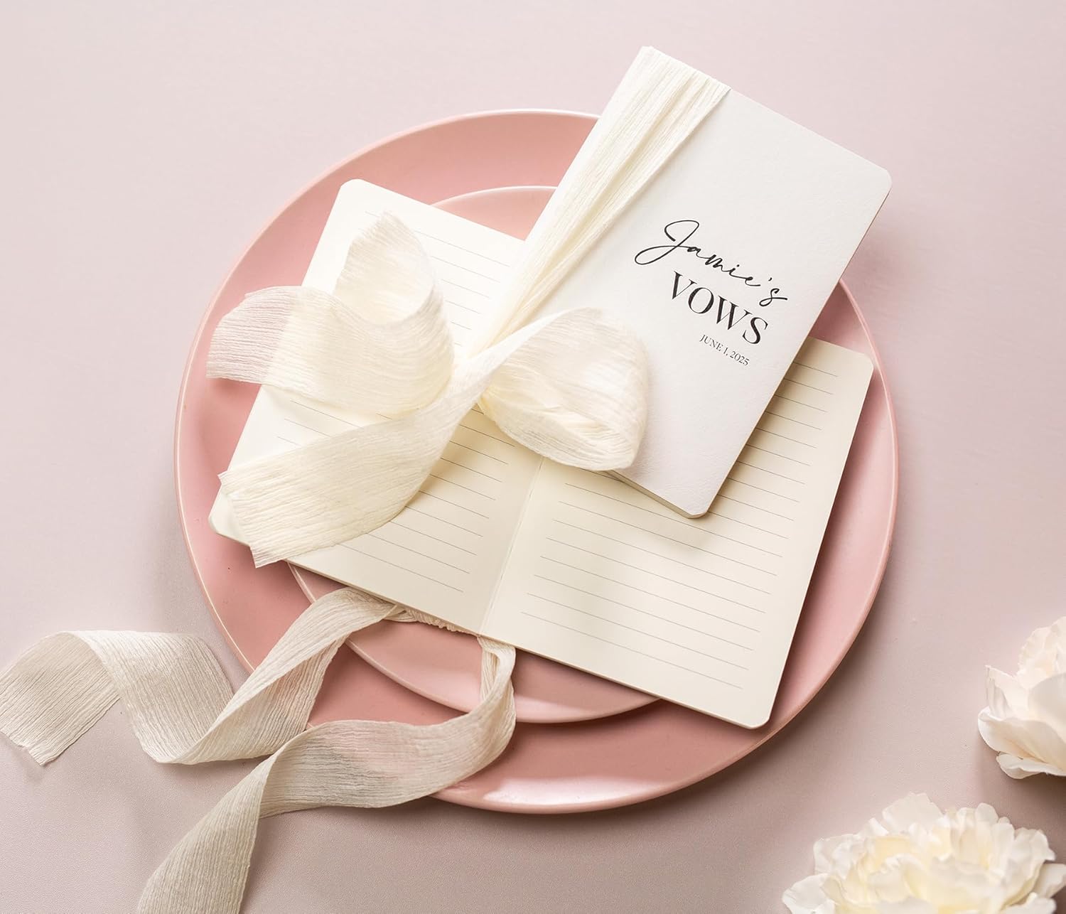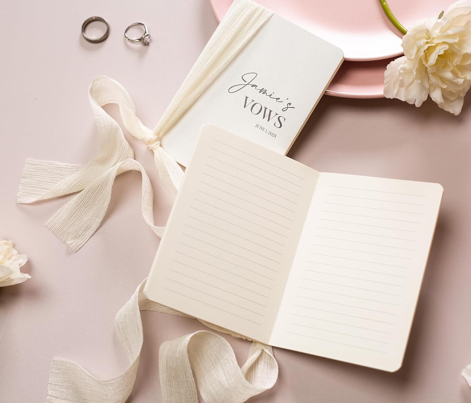 - Each vow book in our set measures 5.625 x 4 x .5 inches, making them pocket-sized for easy carrying. Crafted from high-quality materials, these softcover vow books offer durability with a sophisticated finish. The flowy ivory ribbon adds a touch of romance and softness against the texture of the book.