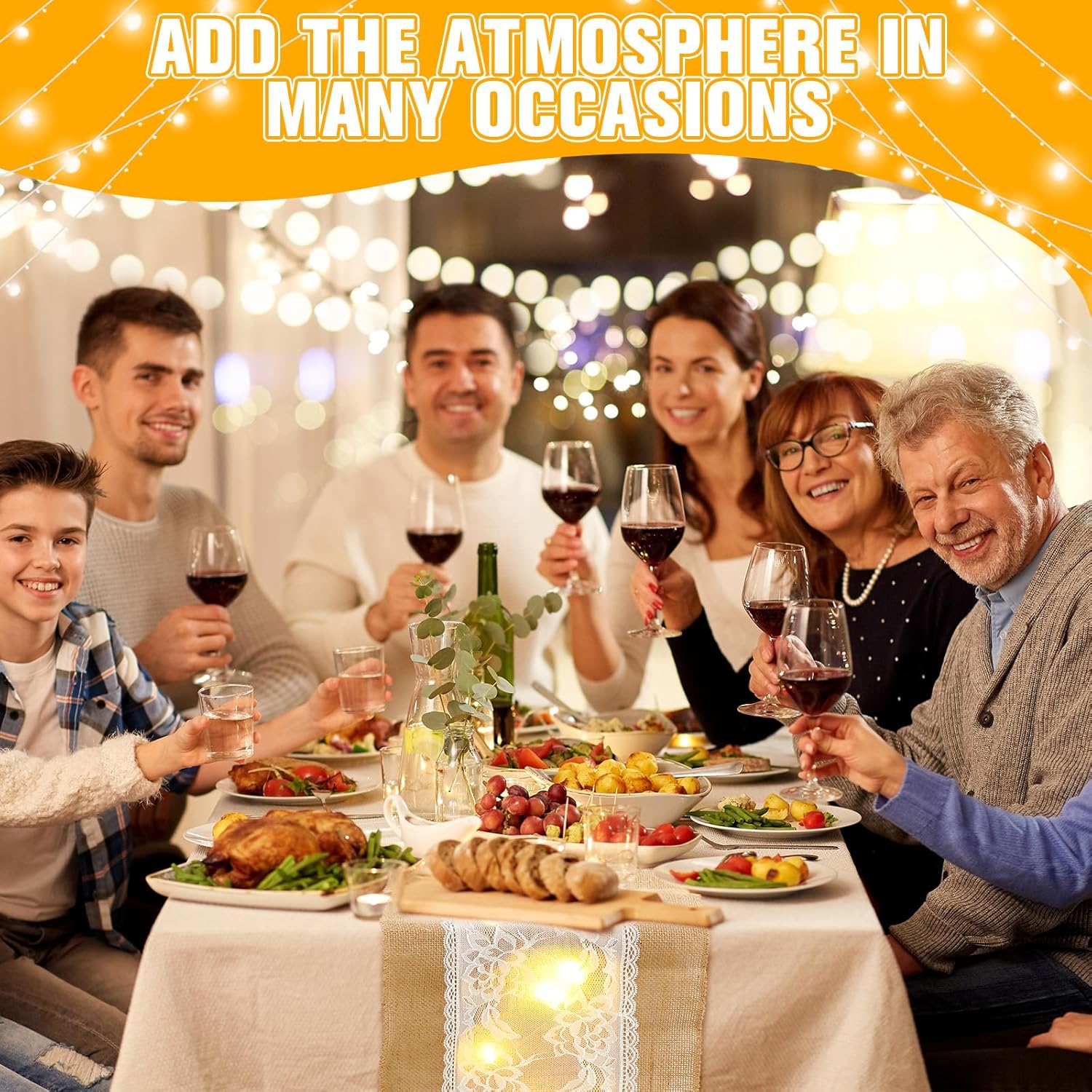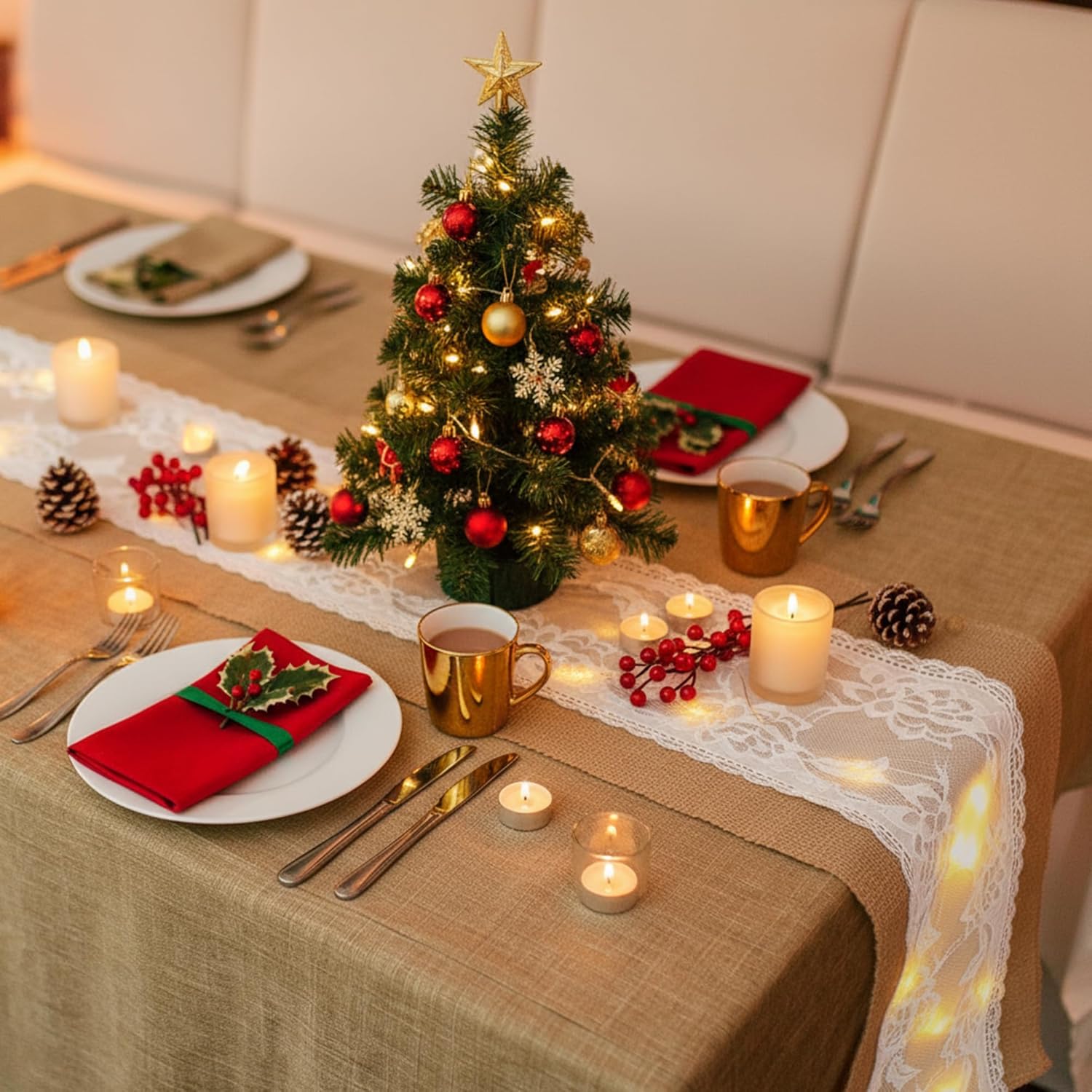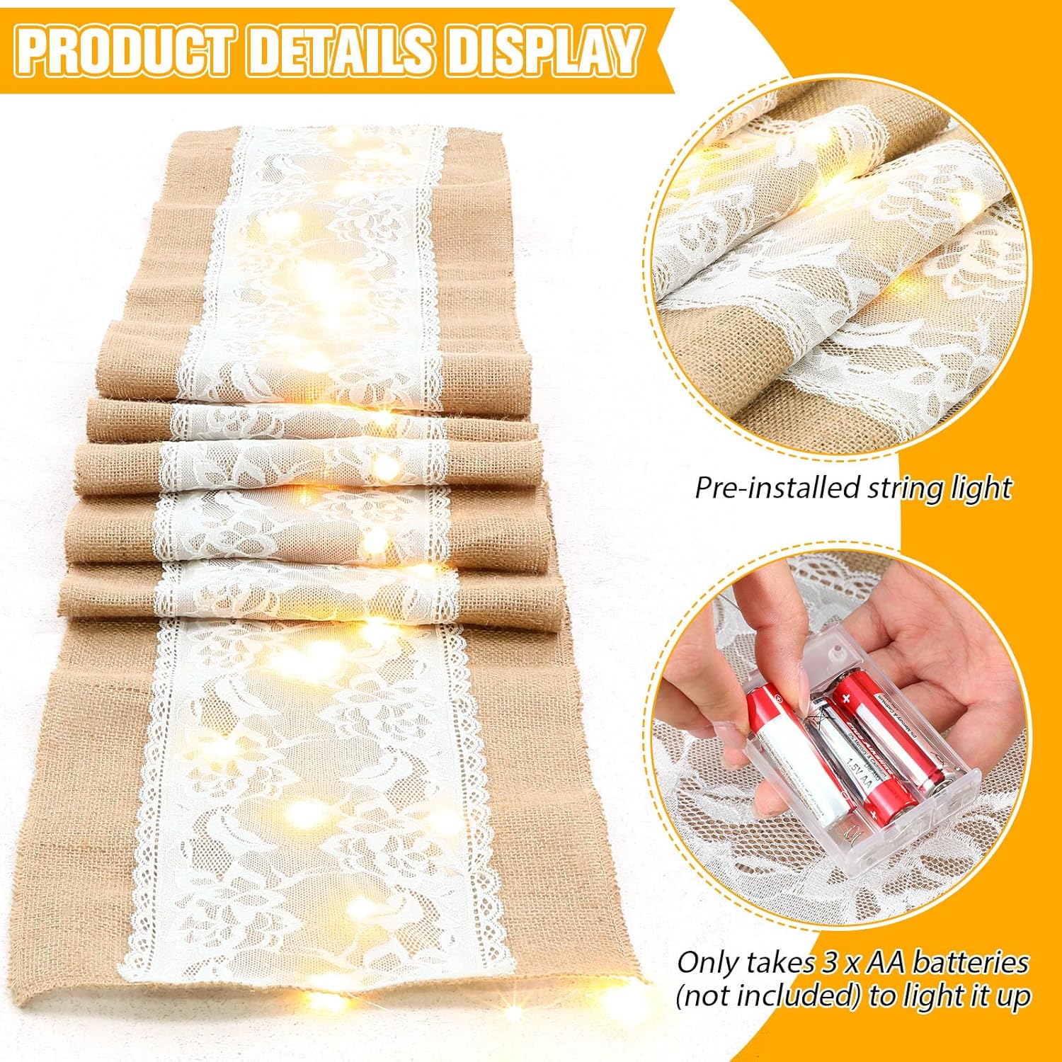 - Light-Up Rustic Elegance: Each burlap table runner features 40 hidden LED bulbs woven under lace, adding a warm glow to weddings, holiday dinners, or evening parties, creating a romantic and festive dining atmosphere