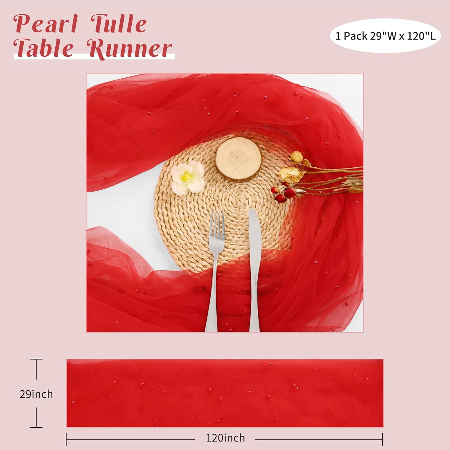 Pearl Table Runner 29 x 120 Inch Tulle Fabric Lace Table Runners Boho Rustic Tablecloth for Bridal Shower Birthday Party Wedding Arch Aisle Veil Dessert Table Decor(1 Pack, Red)