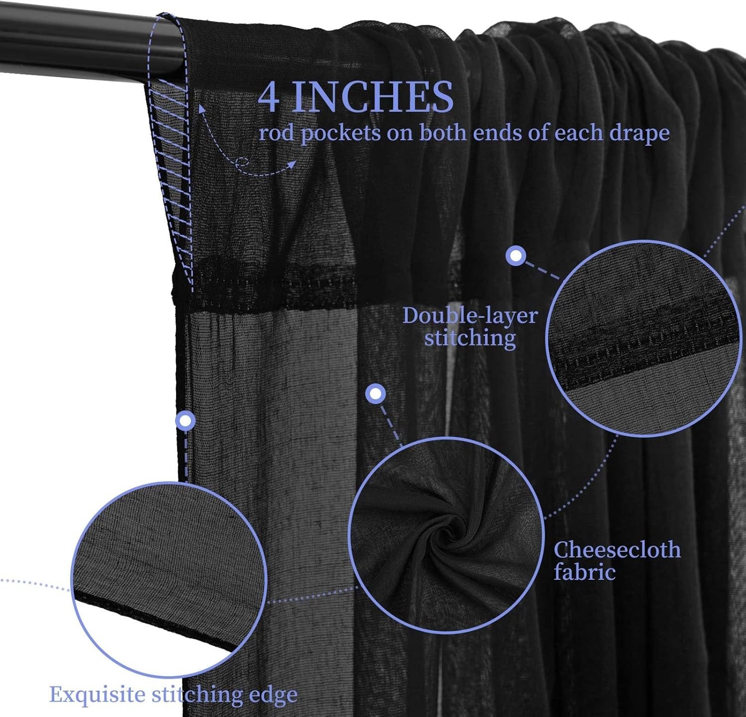 - 【Easy Hanging Draping Fabric】There is a 4 inches pocket for rod or pole entry at the top and bottom of each panel creating beautiful draping. Easy and quick to install, it can be hung vertically or horizontally. Different hanging methods will bring you various visual effects. You can also hang some balloon garland, window curtain lights and artificial flowers with stem to add an elegant and romantic atmosphere.