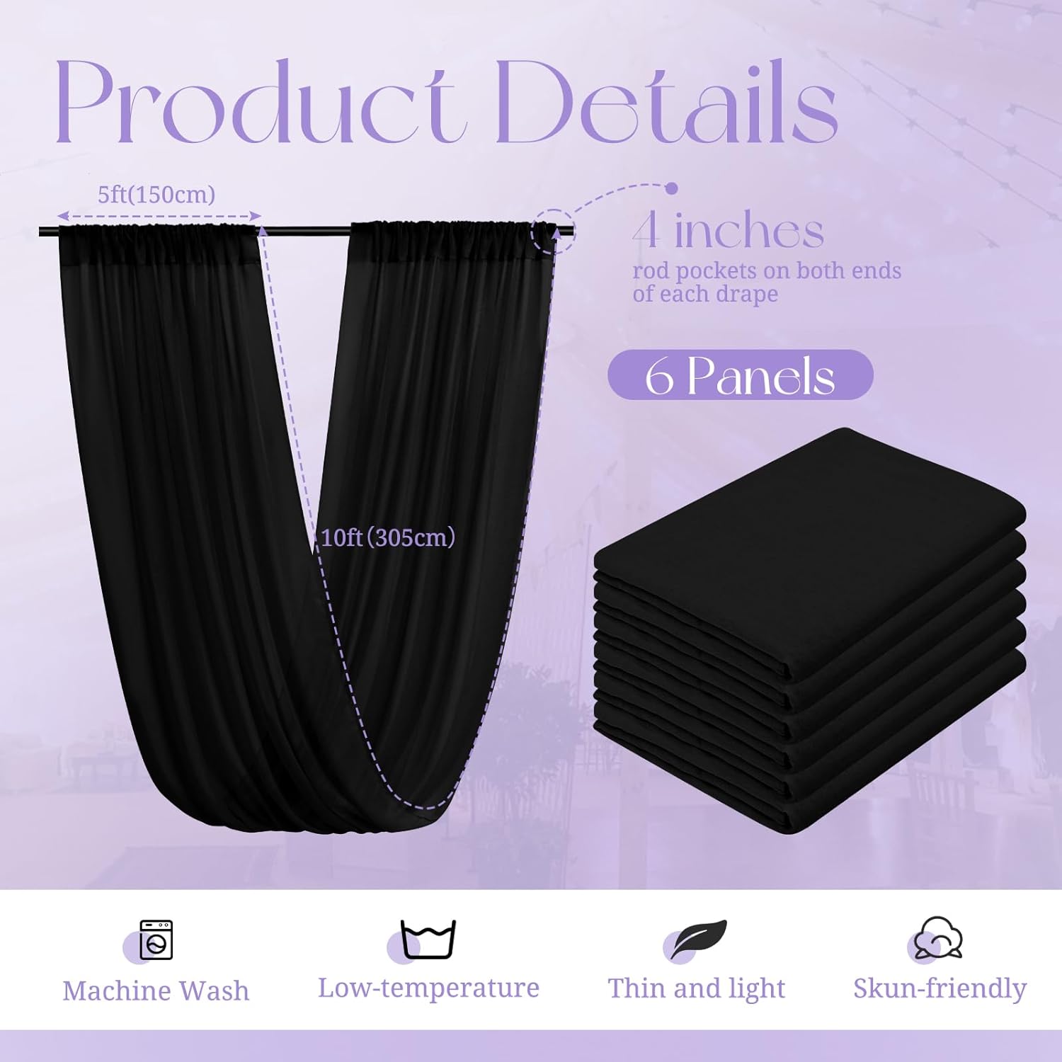 - 【Package Includes】The package will include 6 panels Black wedding ceiling drapes (Not include stand), each wedding extra long curtain measures 5 feet (60inch)wide x 10 feet(120inch) long.The sufficient quantity can meet your demands for decorating your weddings, parties, receptions.