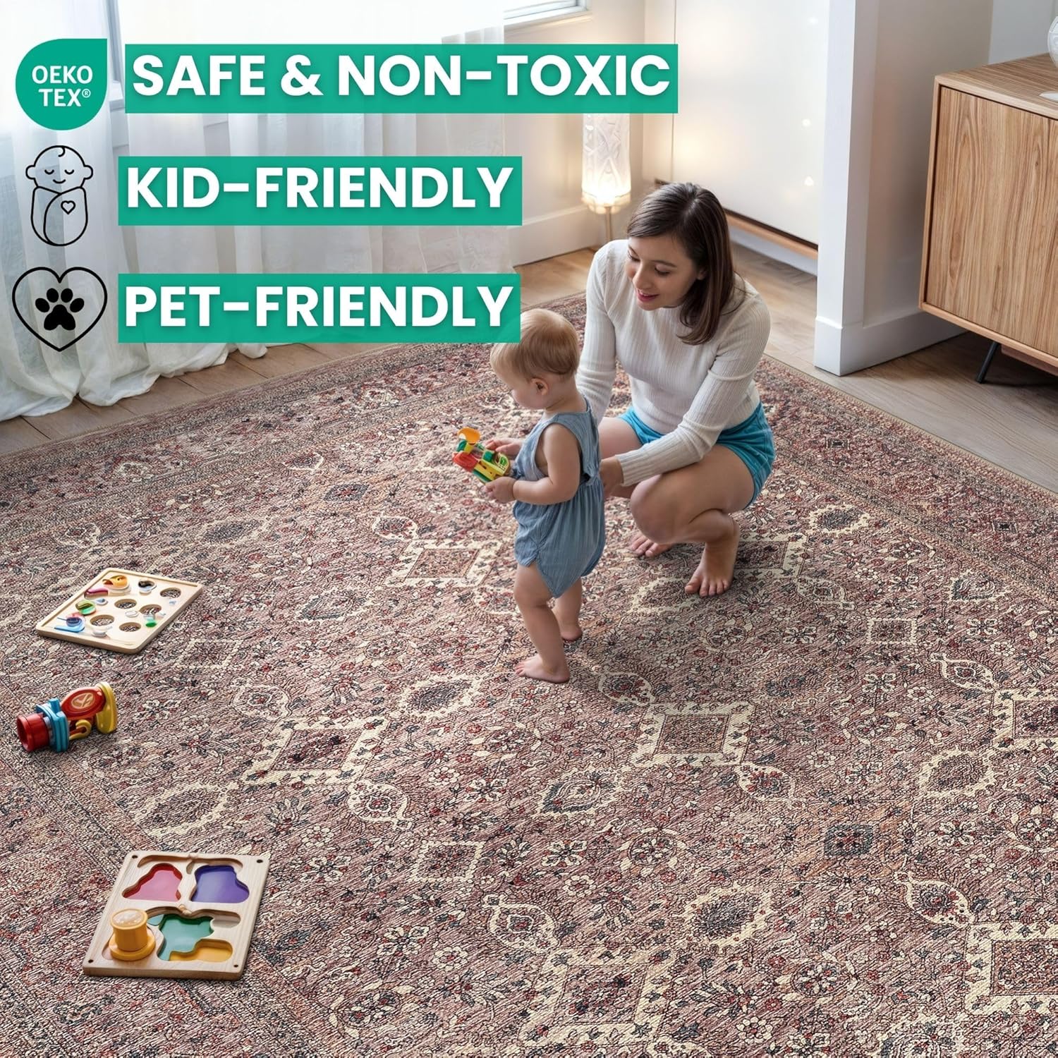 - MACHINE WASHABLE: Machine wash on delicate cycle (do not use bleach) at 85°F (30°C) and line dry or dry on air-only cycle without heat. Vacuum regularly and spot clean small stains. This easy to clean rug is perfect for families with kids and pets, and for high traffic areas.