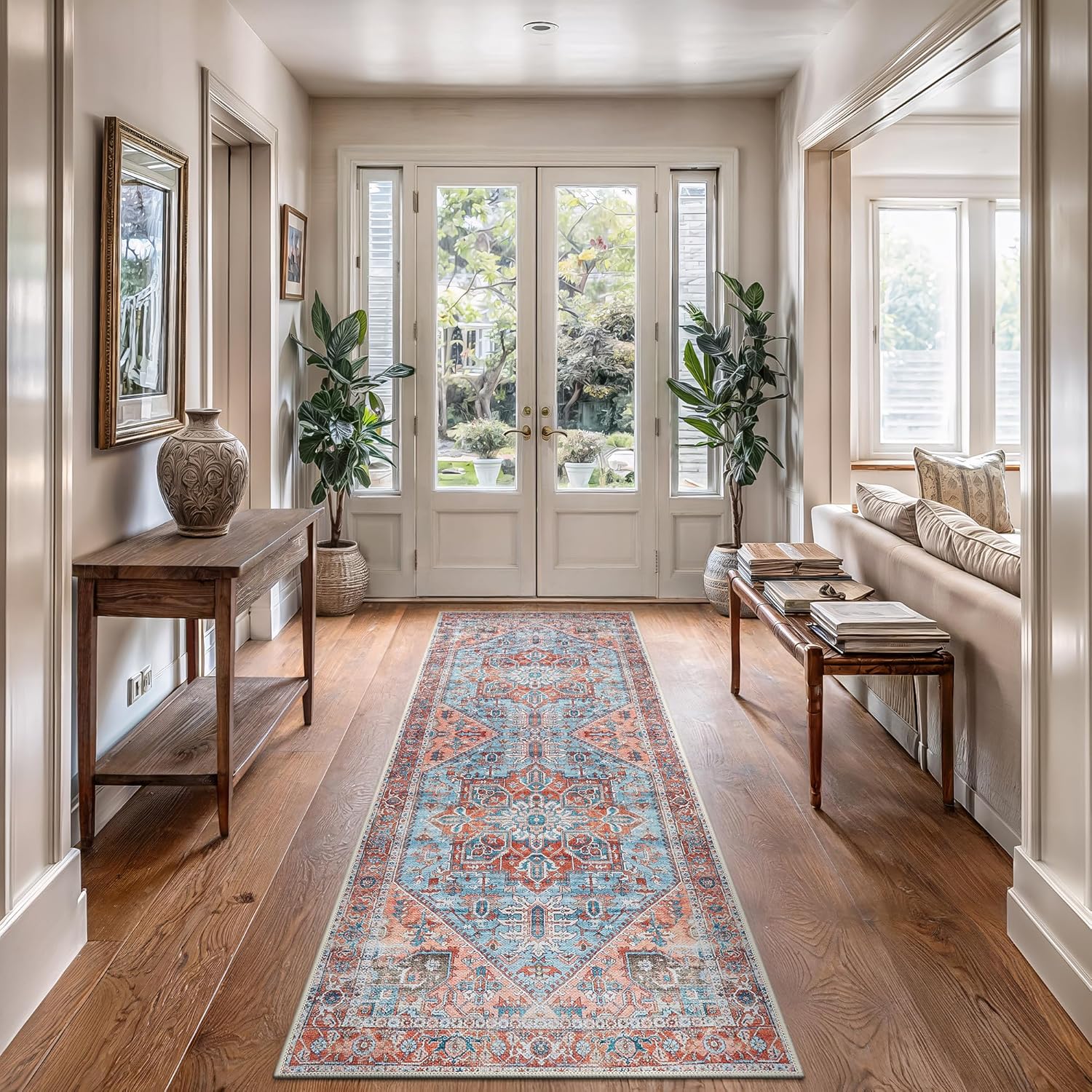 Bloom Rugs Washable Non-Slip 10 ft Runner - Coral/Sky Blue Traditional Medallion Runner for Entryway, Hallway, Bathroom, and Kitchen - Exact Size: 2.5' x 10'