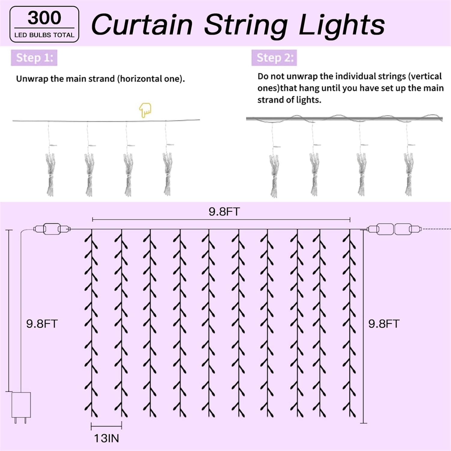 - 9.8FT x 9.8FT Coverage with 300 Brilliant LEDs - Soagrc 9.8FT x 9.8FT curtain features 300 warm white LEDs for a soft, ambient glow. Hang them over your bedframe, behind sheer curtains, or across a large window to create dreamy lighting. Includes a 9.8FT extension cord for easy positioning even in hard to reach outlets