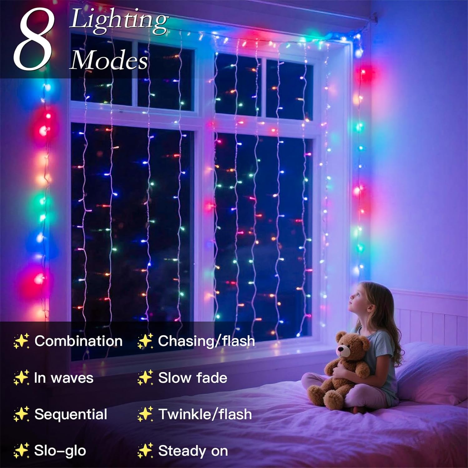 300 LED Rainbow Curtain String Lights 9.8 * 9.8FT Plug in Fairy with Timer and 8 Modes, Waterproof Window Wall Lights for Bedroom Wedding Party Indoor Outdoor Christmas Decor