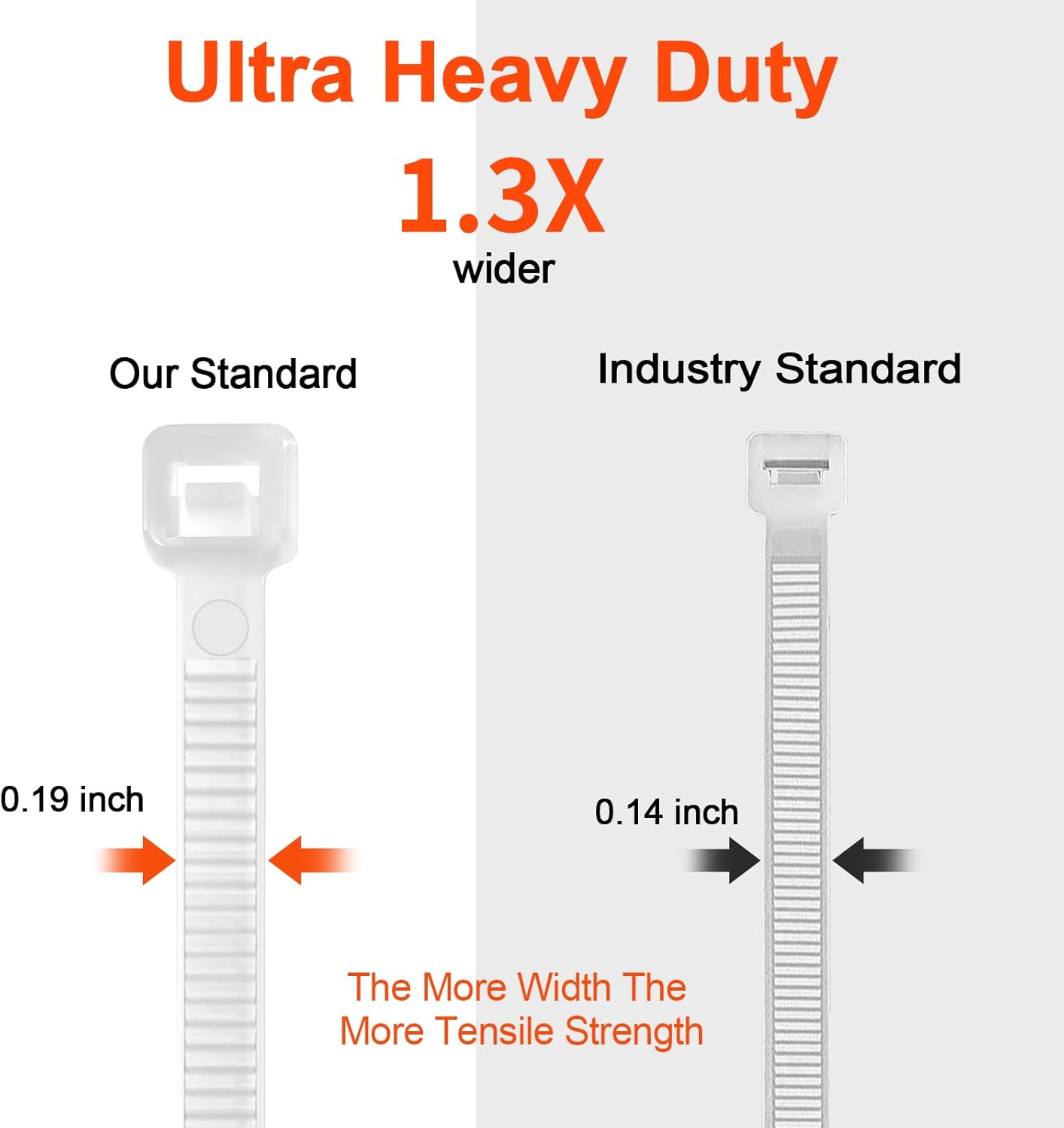 - 【120lb Tensile Strength】: The more width and Thickness, the more tensile strength. our zip ties 12 inch width is 0.19 inch(4.8mm), while industry standard is 0.14 inch(3.6mm), our zip ties 12 inch Thickness is 0.065" inch(1.65 mm), while industry standard is 0.05 inch(1.25mm),more tensile strength.