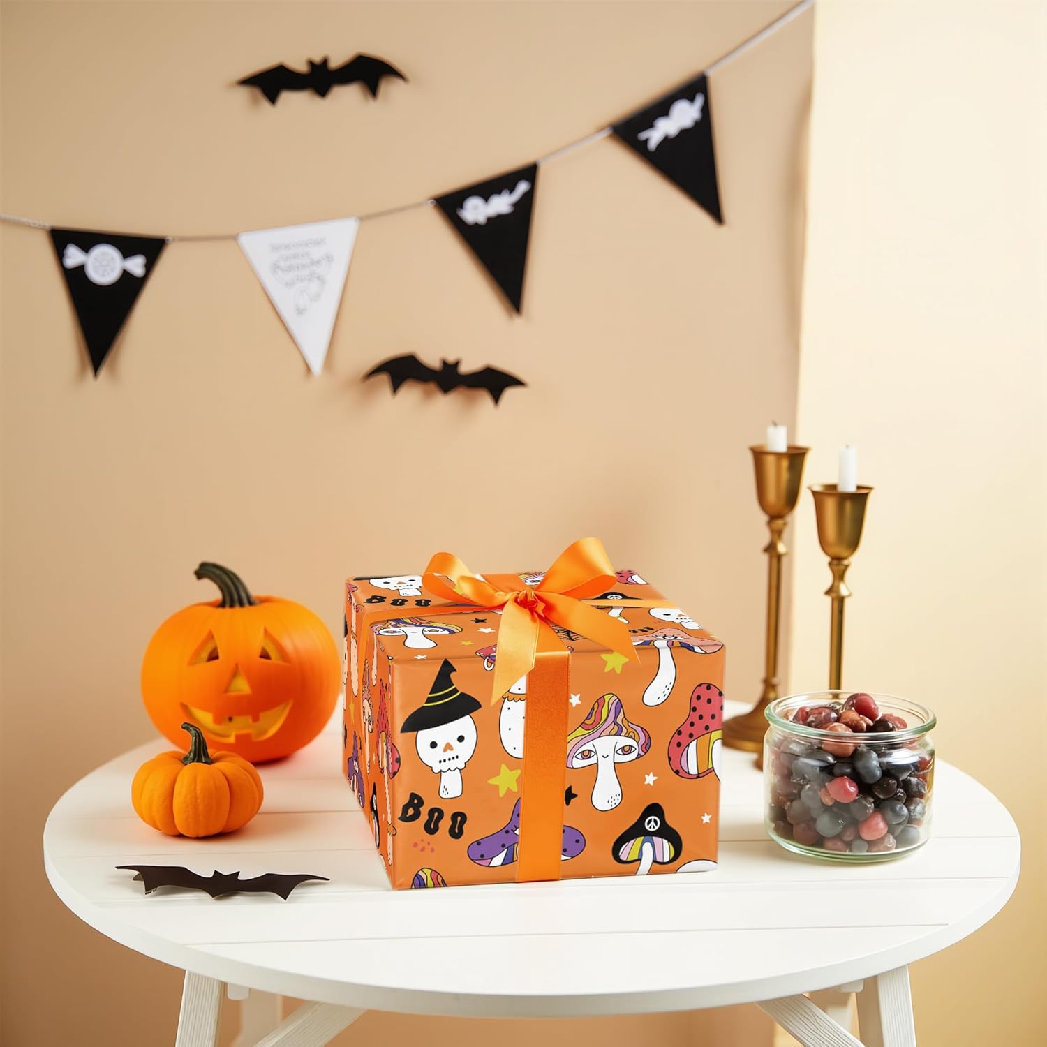 - Halloween Creepy Mushroom Wrapping Paper: Features colorful mushrooms with eyes, skull heads, peace signs, witch hats, spider webs, stars, and “BOO” text on a bold orange background—perfect for a spooky and surreal vibe.