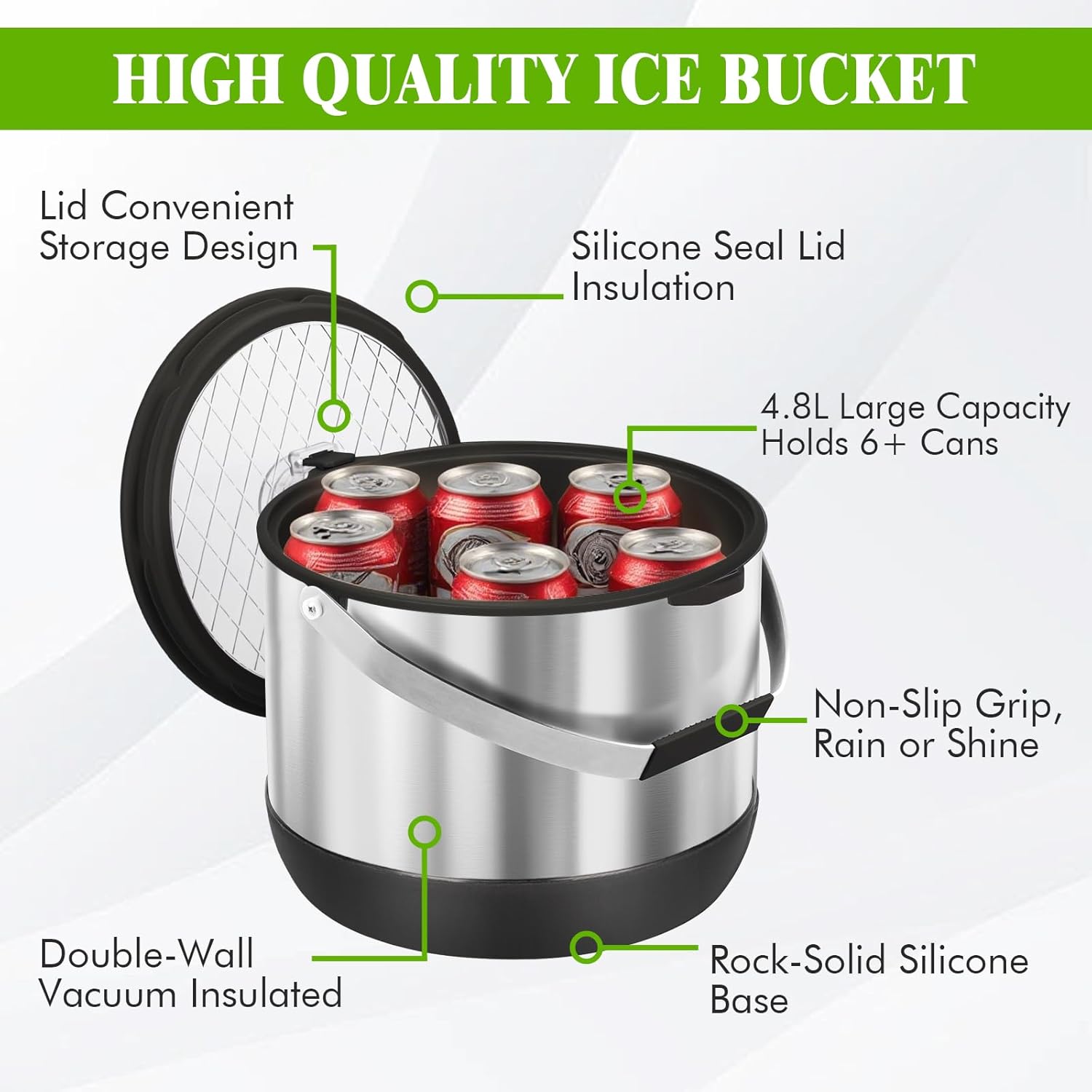 - 【4.8L Large Capacity】This large 162-oz ice bucket can hold 9 cans , perfect for a cocktail party. Say goodbye to the hassle of refilling small ice buckets every hour! It's perfect for cocktail bars, dinner parties, weddings, and backyard barbecues, and it reduces ice consumption by 50%.