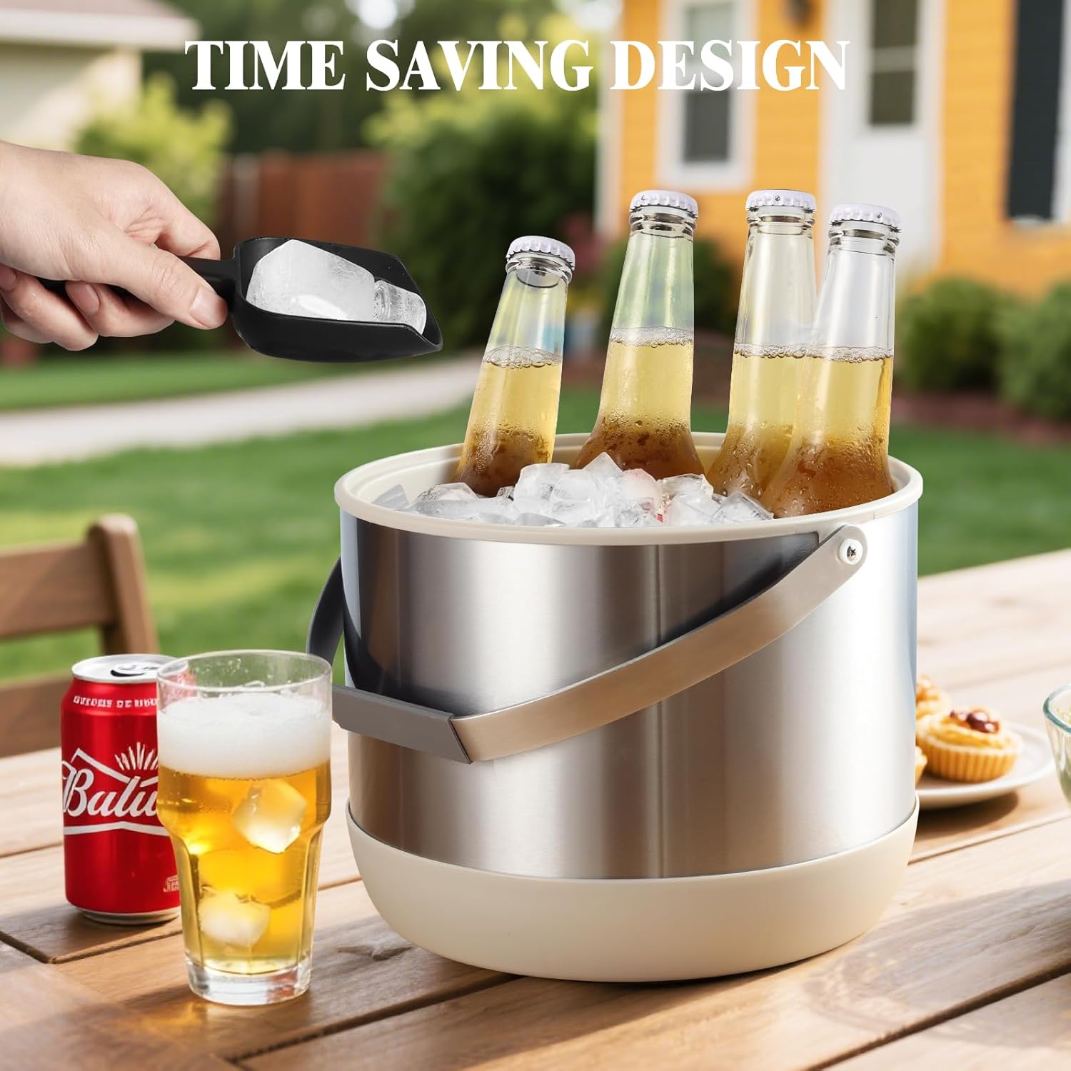 - 【4.8L Large Capacity & Upgrade Scoop】This large 162-oz ice bucket can hold 9 cans , perfect for a cocktail party. Say goodbye to the hassle of refilling small ice buckets every hour! It's perfect for cocktail bars, dinner parties, weddings, and backyard barbecues, and it reduces ice consumption by 50%. Our innovative ice scoop features a clean hanging design that hooks effortlessly onto your ice bucket. Enjoy ultimate portability as it travels attached, making it your ready companion for BBQs, camping and beach trips