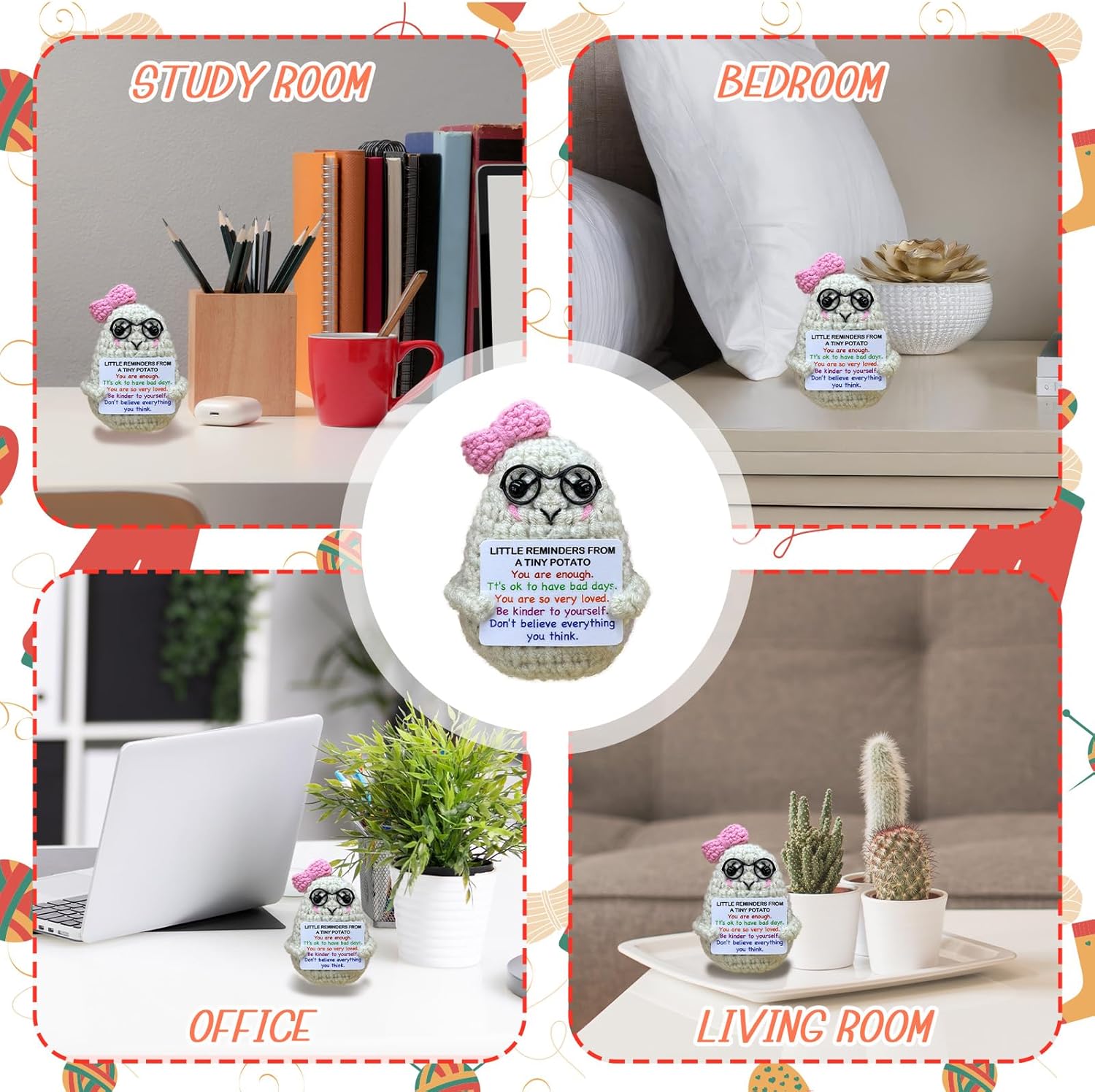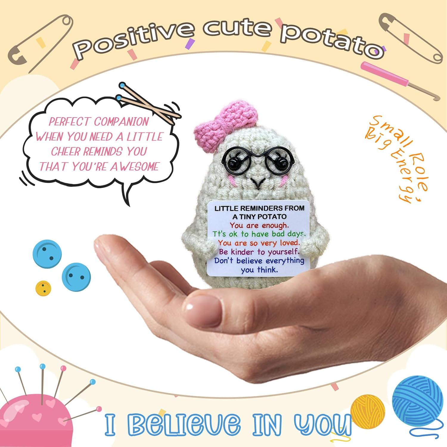 Handmade Crochet Positive Potato Gifts for Women Men Daughter Son Birthday,Teacher Nurse Week Graduation Gift,Handmade Kintted Crochet Doll with Emotional Encouragement Card,Desktop Decors