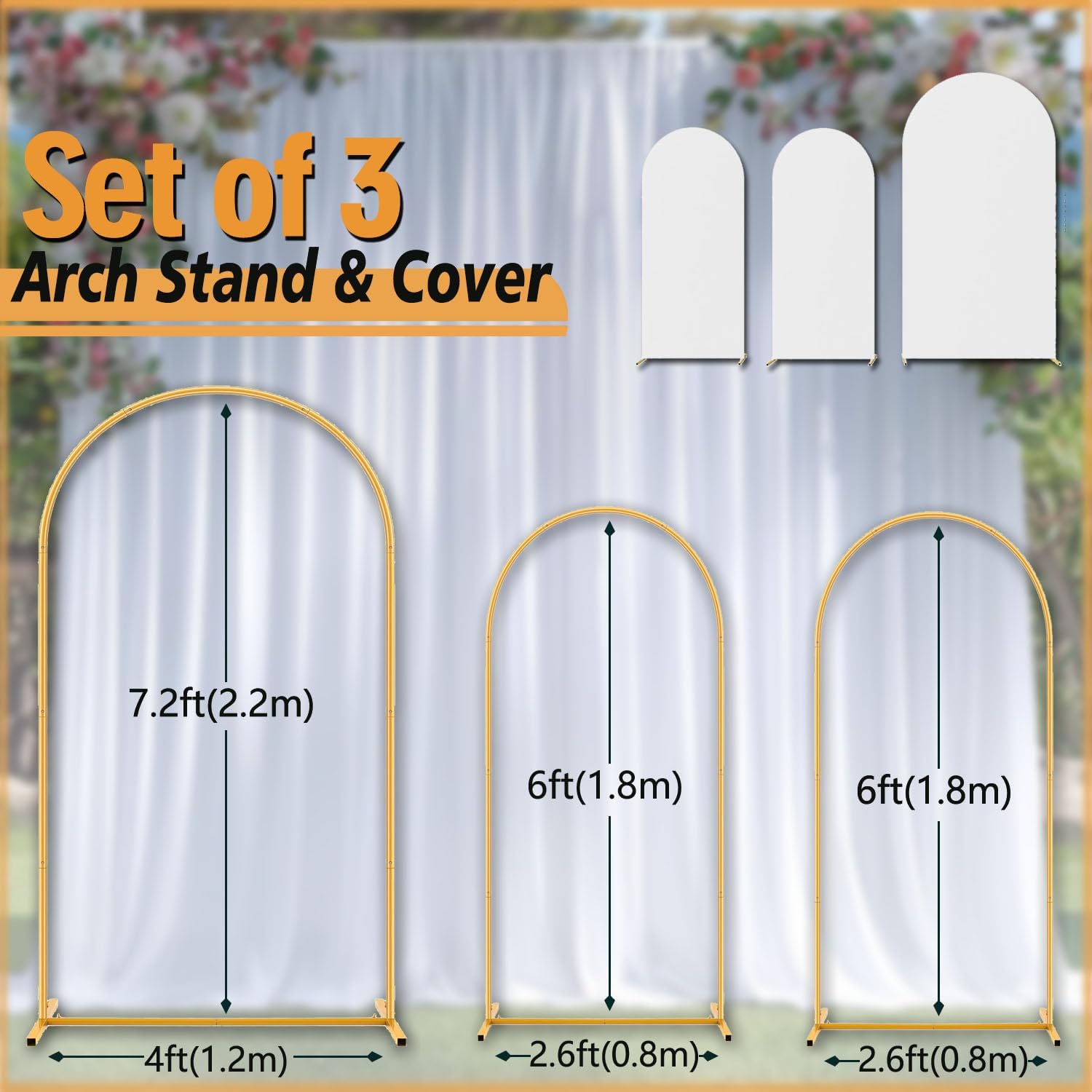 - Arch Backdrop Stand and Covers Set Package contains 3 Gold arches stand for wedding and 3 White Spandex arch backdrop covers with dimensions of 7.2FT and 6FT.x2. A large tote bag,3 x storage bags, A pair of protective gloves๏ผ12 Pcs Outdoor Landscape Staples.