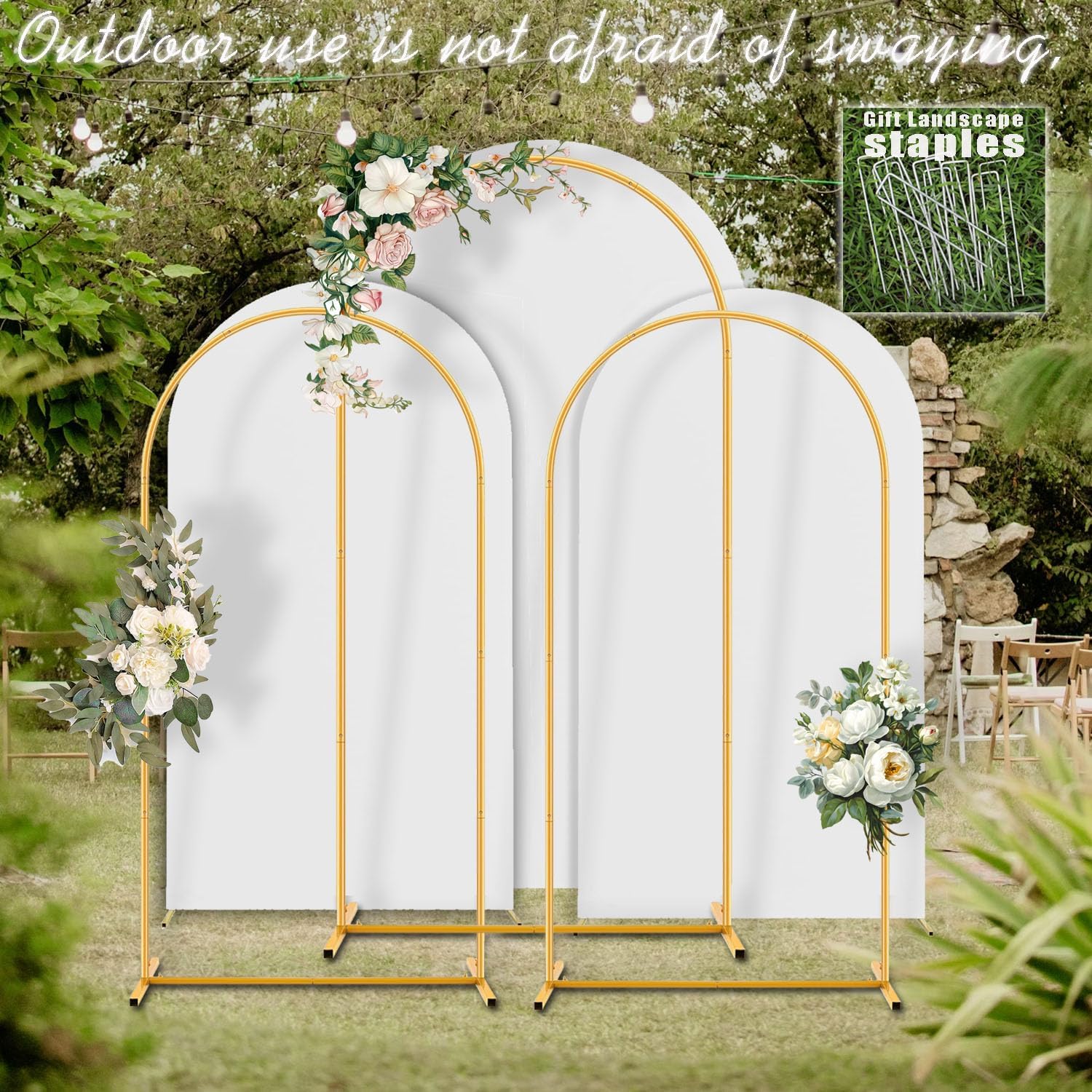 - Stay Focused on Arched Stand -Heavy Duty Metal Material,not on wobbly wedding arch stand backdrop problems. If used outdoors, you can also use the Landscape Staples we provide as a gift