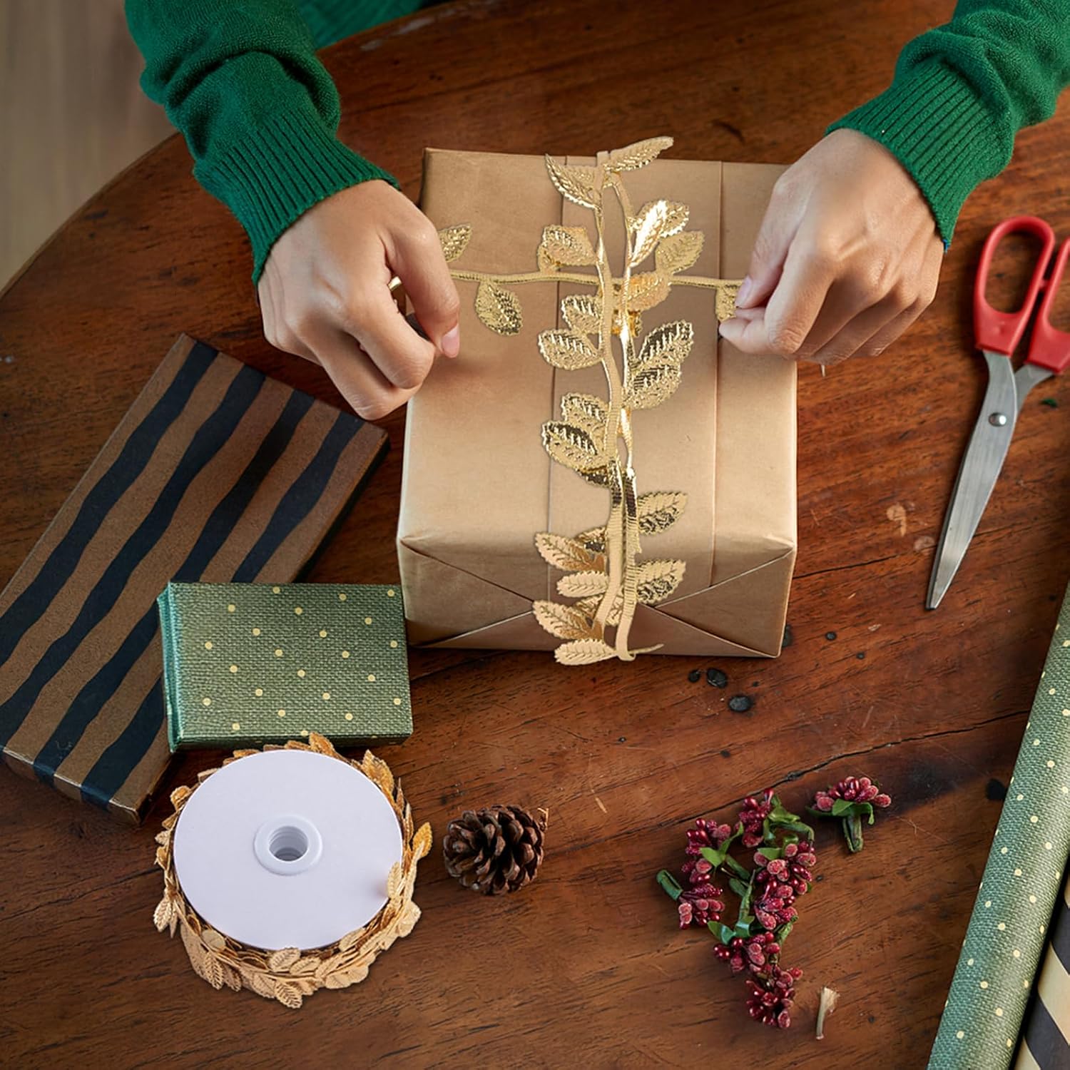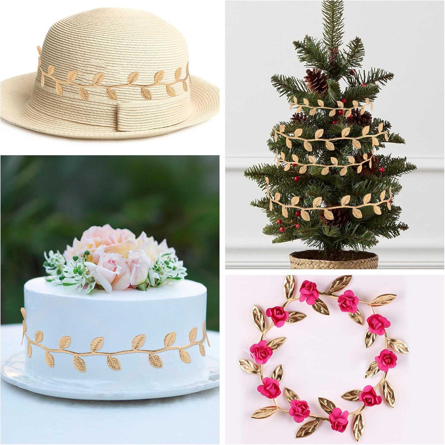 - SHINY GOLD LEAF RIBBON DESIGN:Artificial Gold Leaf Ribbon Features Clear Leaf Texture On Both Sides,Golden Leaves Ribbon Has The Beauty, Sturdiness,Shiny Gold Leaf Trim Will Make Your Project Very Tasteful With Beautiful Shades.