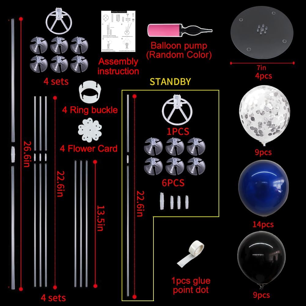- Package Includes: The balloon arch kit includes 4 reusable balloon centerpiece table decorations and 12inch 32 pcs Latex Balloons (14 dark blue balloons,9 black balloons,9 silver confetti balloons),glue point dots,balloon pump,balloon clips,and tie tool.You don’t need to waste money to buy balloons