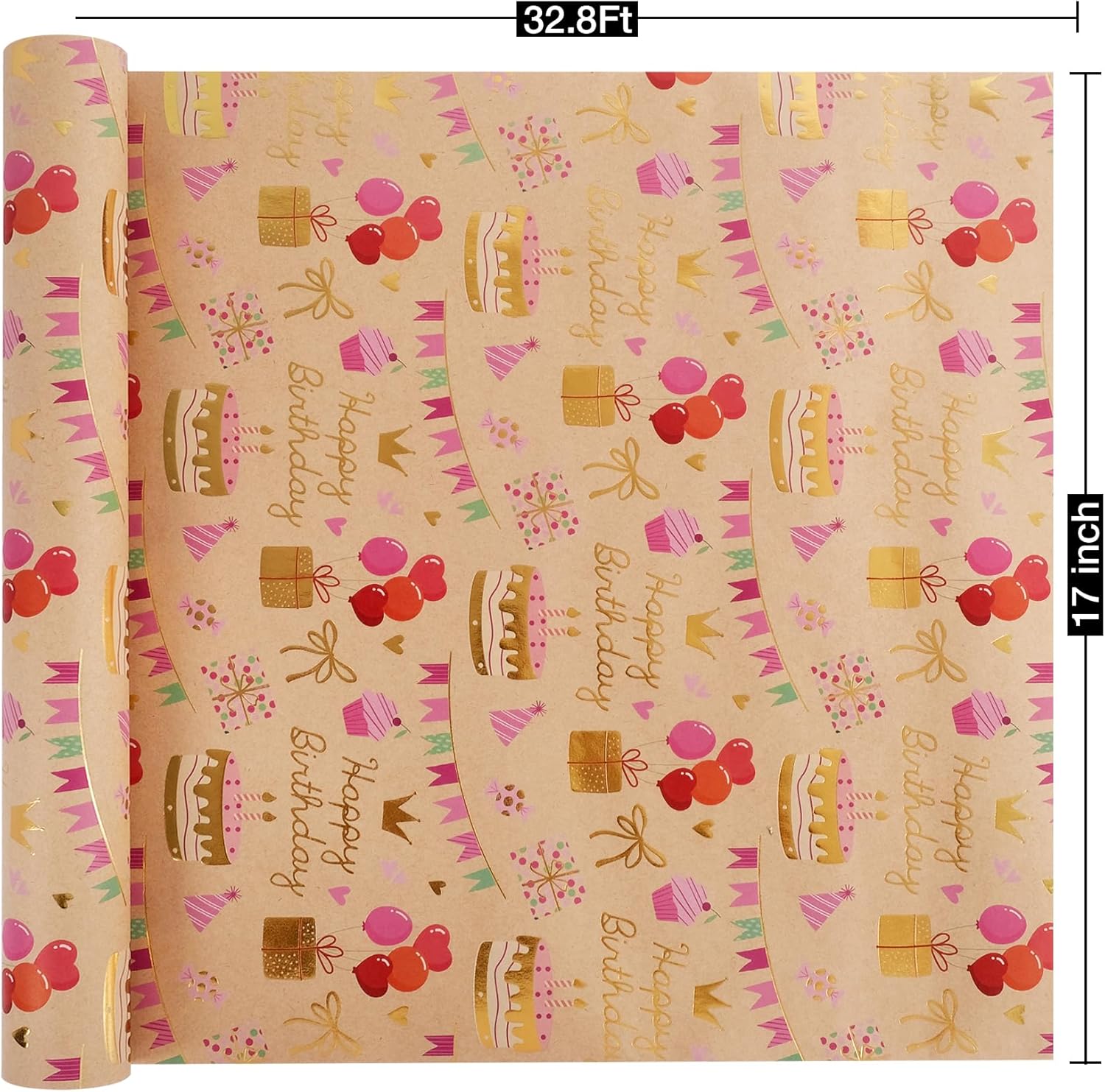 Aimyoo Birthday Wrapping Paper Roll - 17 Inch X 32.8 Feet - Gold Foil Celebration Cake, Gift Box,Happy Birthday Lettering Design Gift Wrap for Kids, Baby Showers