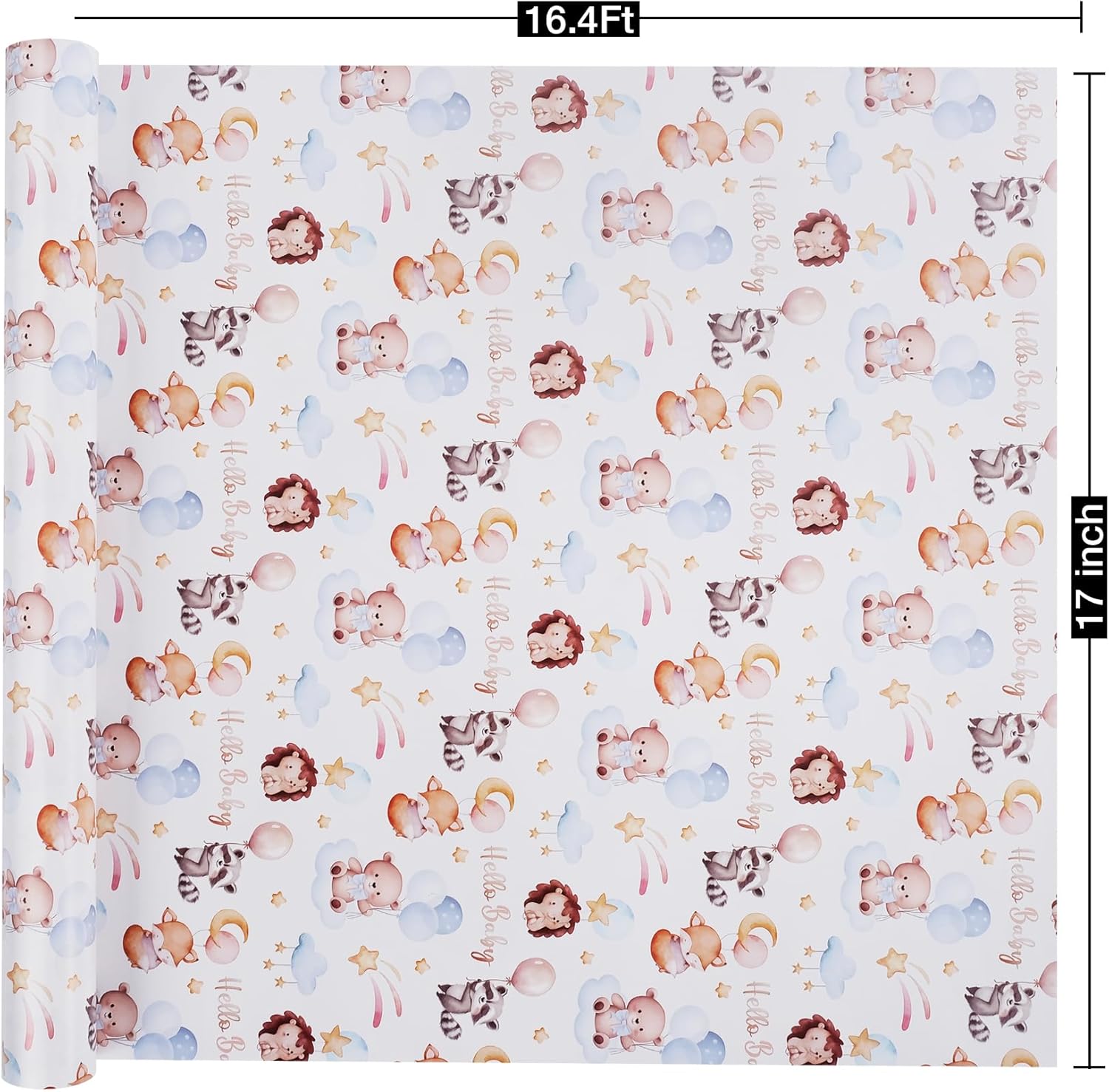 Aimyoo Baby Shower Wrapping Paper Roll - 17 Inch x 16.4 Feet - Cute Animal with Hello Baby Letter Design Perfect for Boys Girls, Birthday, Party