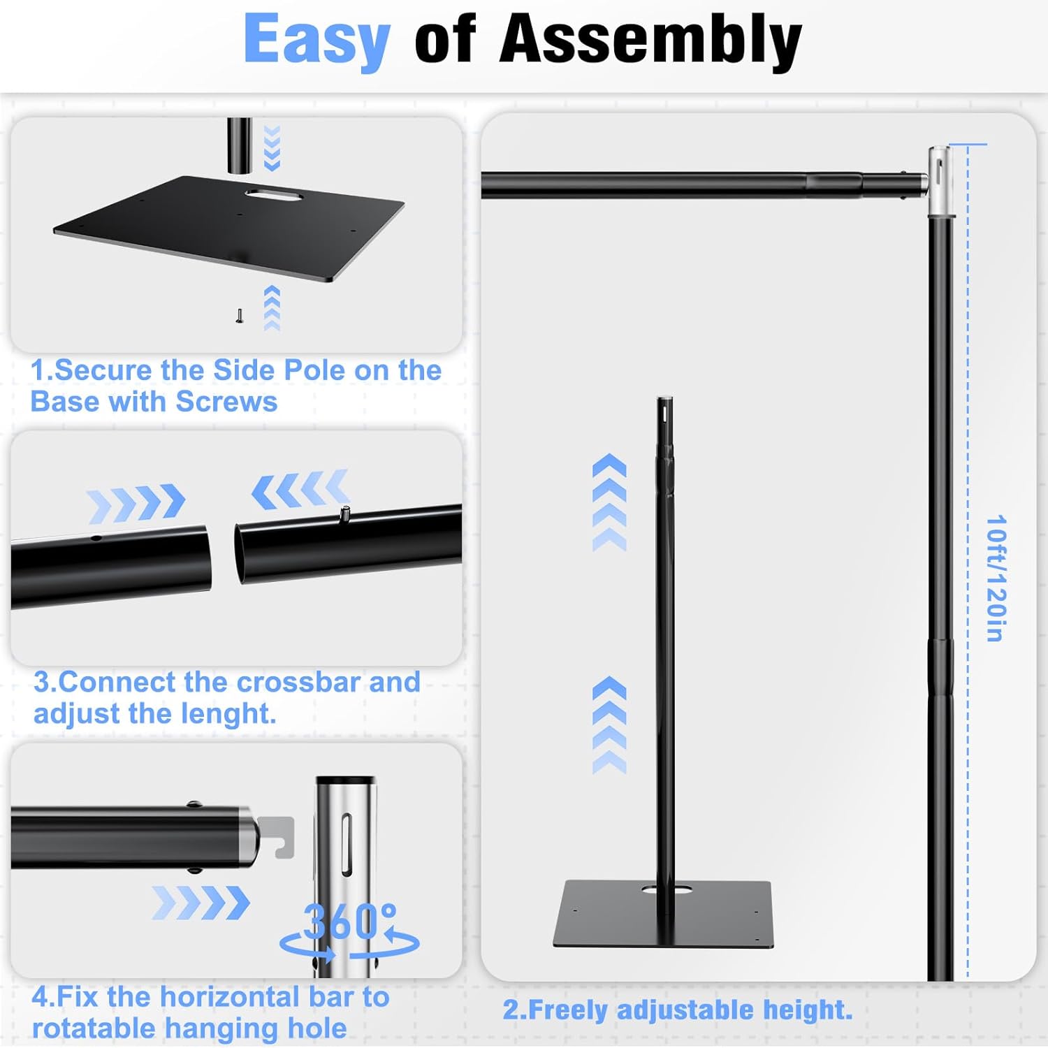 - Easy Setup and Portability: This backdrop stand can be set up and taken down in minutes. The included carrying case allows for easy transportation and storage, it is space-saving and convenient.Kindly Note: Please watch the installation video before starting install.Note: To avoid hanging holes crack, please remove the top rod before adjusting the hanging holes at both ends.