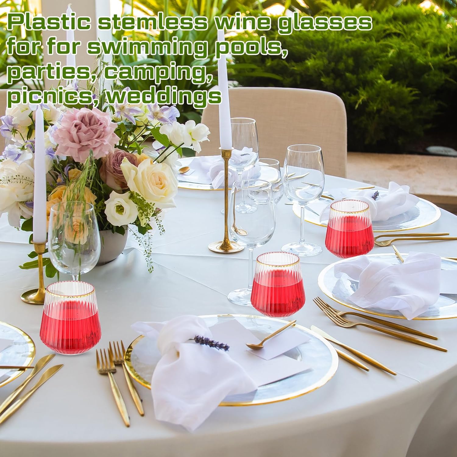 Suclain Plastic Wine Glasses Ribbed Stemless Wine Glasses 14oz Vertical Design Unbreakable Cups for Outdoor Indoor Vintage Elegant Champagne Whiskey Cups for Party Wedding(Clear, Gold,50 Pcs)