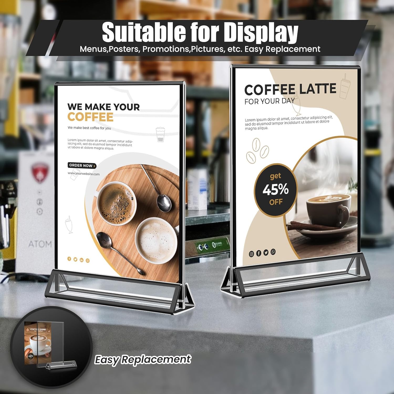 - 【Easy to Assemble】Only 3 steps to get the acrylic stand ready for use, firstly tear off the protective film on the acrylic blackblack frame, adopt the triangular groove base for better inserting the table sign or anything you want to display. At last, push the frame into the base. And if you want to store them, you can just separate the frame and base and put them into a box without any hassle.