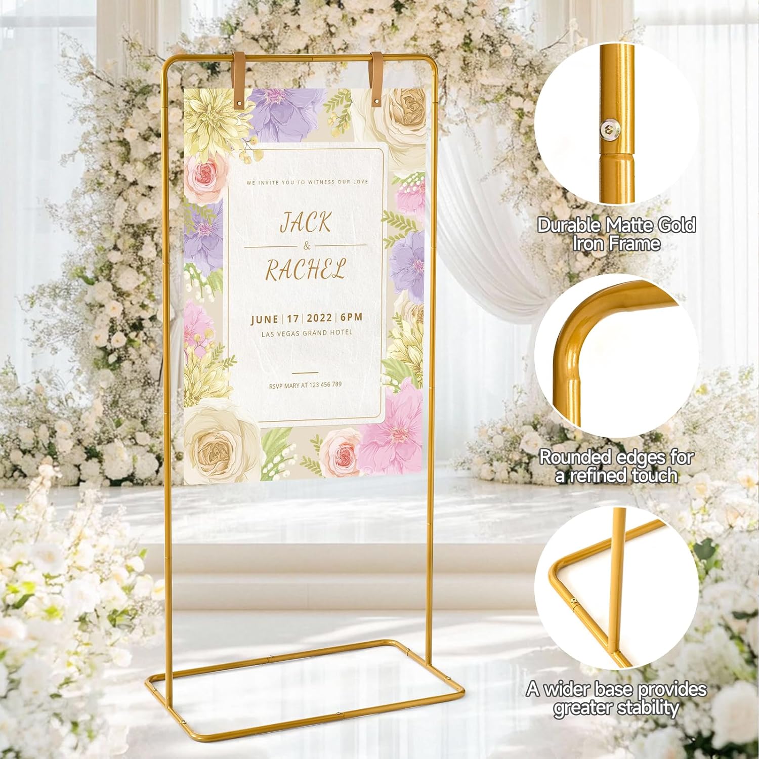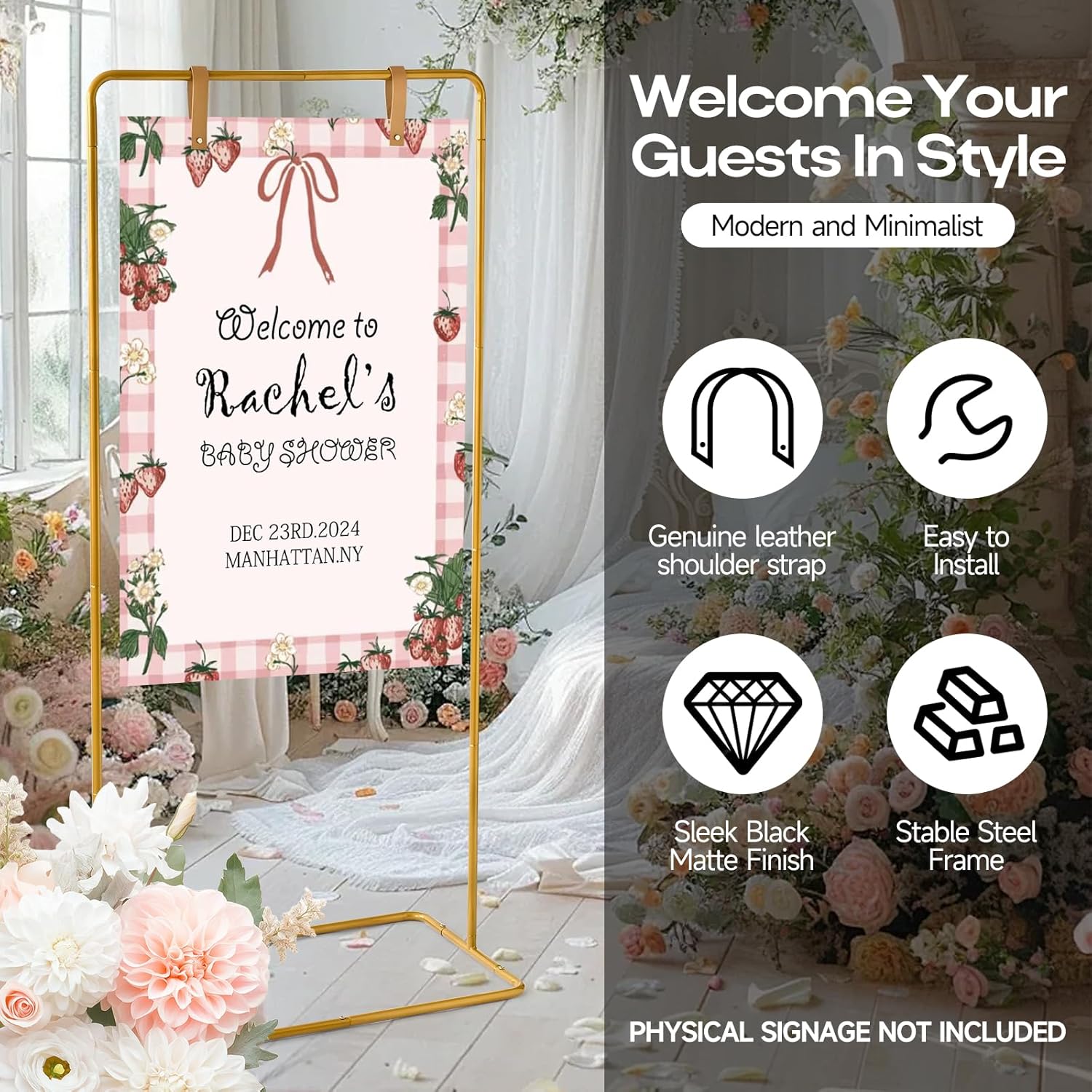 Wedding Sign Stand - Adjustable Wedding Sign W/Design Bundle & Leather Sign Hanging Straps, Durable Metal Easel Stand for Wedding Welcome Signs, Seating Charts, Ceremony & Reception Decor (Gold)