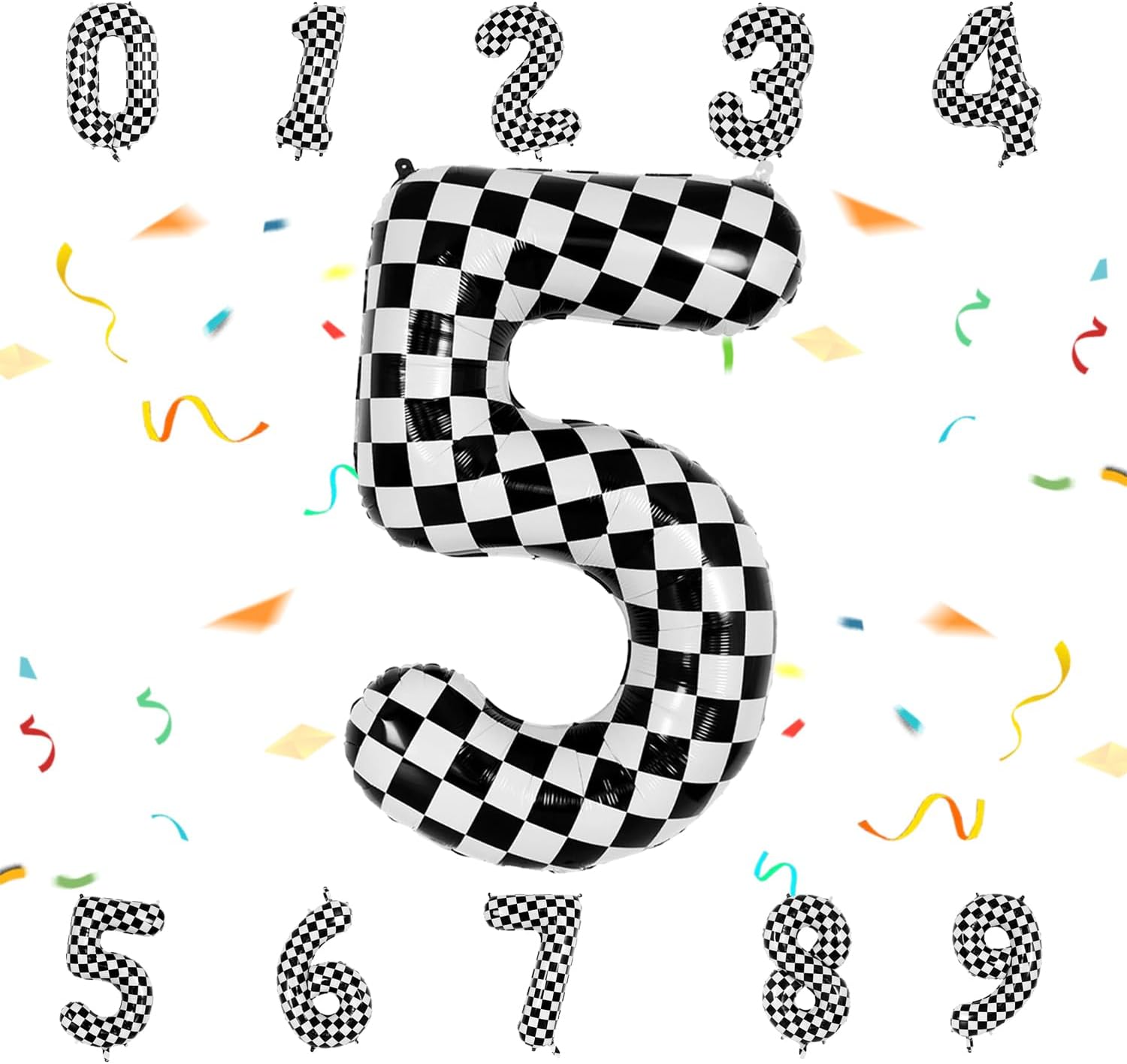 40 Inch Checkered Number Balloon - Race Flag Pattern Big Helium Balloon for Birthday Party Decorations - Black & White Balloon for Kids Adults Party Supplies (Racing Car, Number 5)