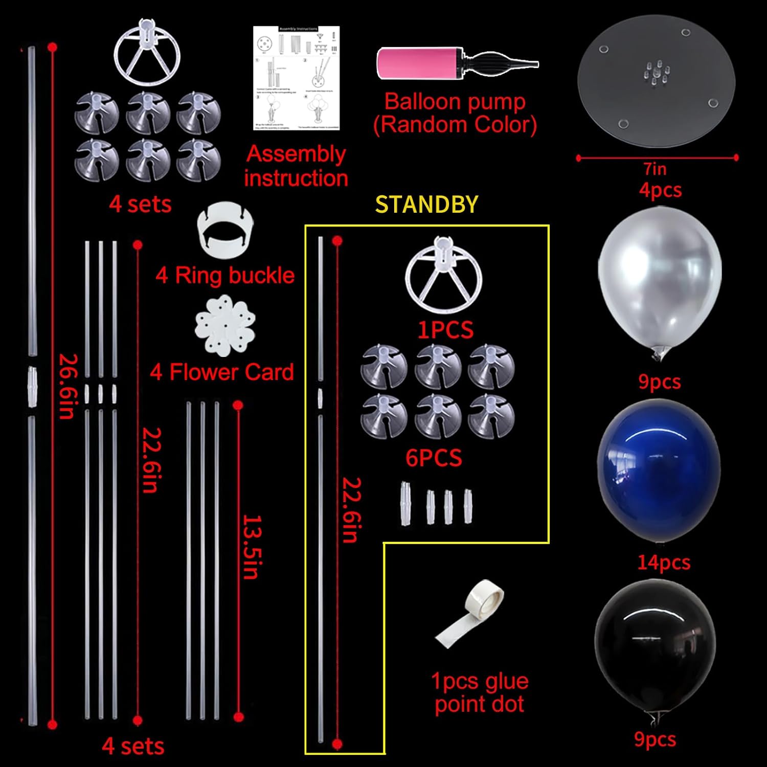 - Package Includes: The balloon arch kit includes 4 reusable balloon stands and 12 inch 32 pcs Black Blue Silver balloons(14 dark blue balloons,9 black balloons and 9 silver balloons),glue point dots,balloon pump,balloon clips,and tie tool.You don’t need to waste money to buy balloons