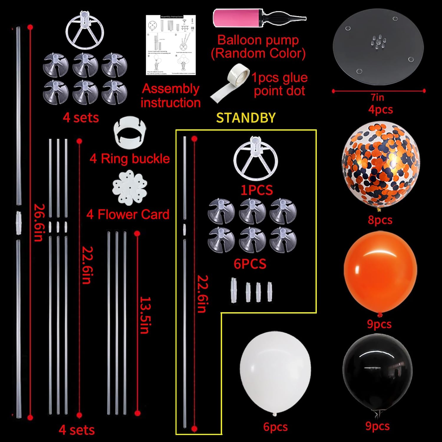 - Included Components : Balloon Stand, Black and Orange Balloons, Filling Pump, Glue, Tying Tool