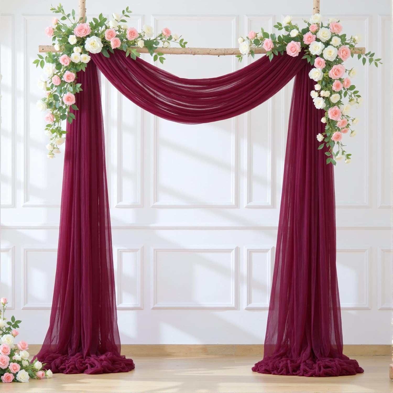 - Best Choice Wedding Arch: Package includes 2 panels burgundy wedding arch sheer drapes, each panel is 60 inches wide and 26 ft long. The drape of the fabric is perfect for use in a wedding arbor. These arch fabric add a pretty touch to pillars at a wedding.