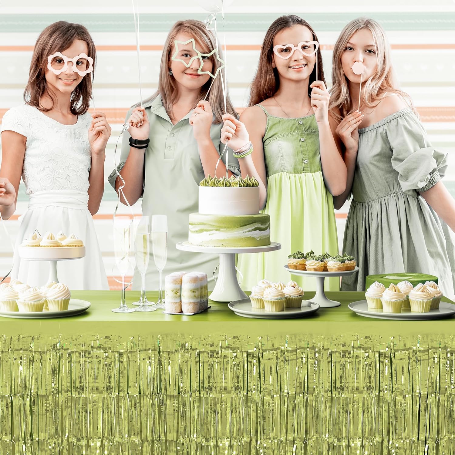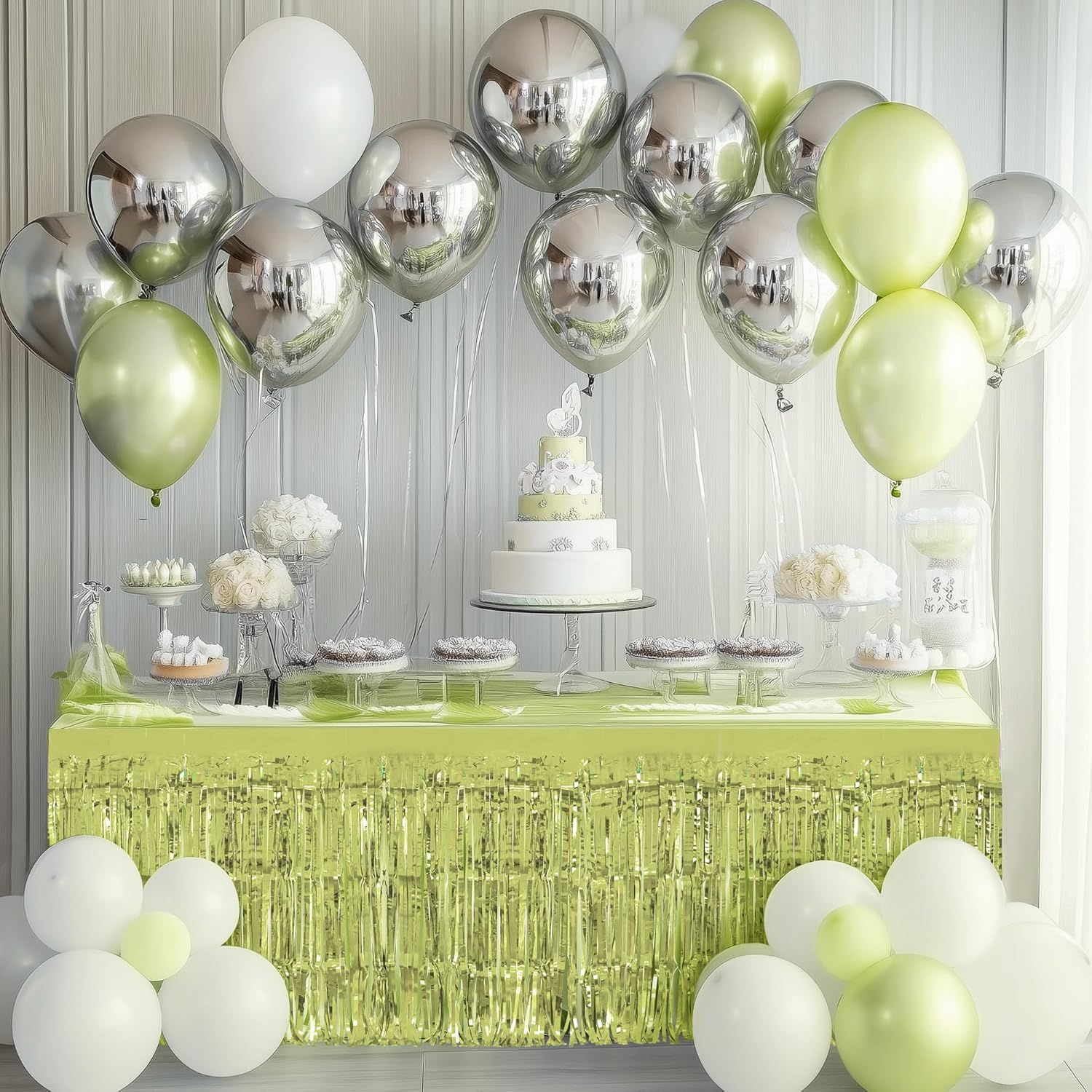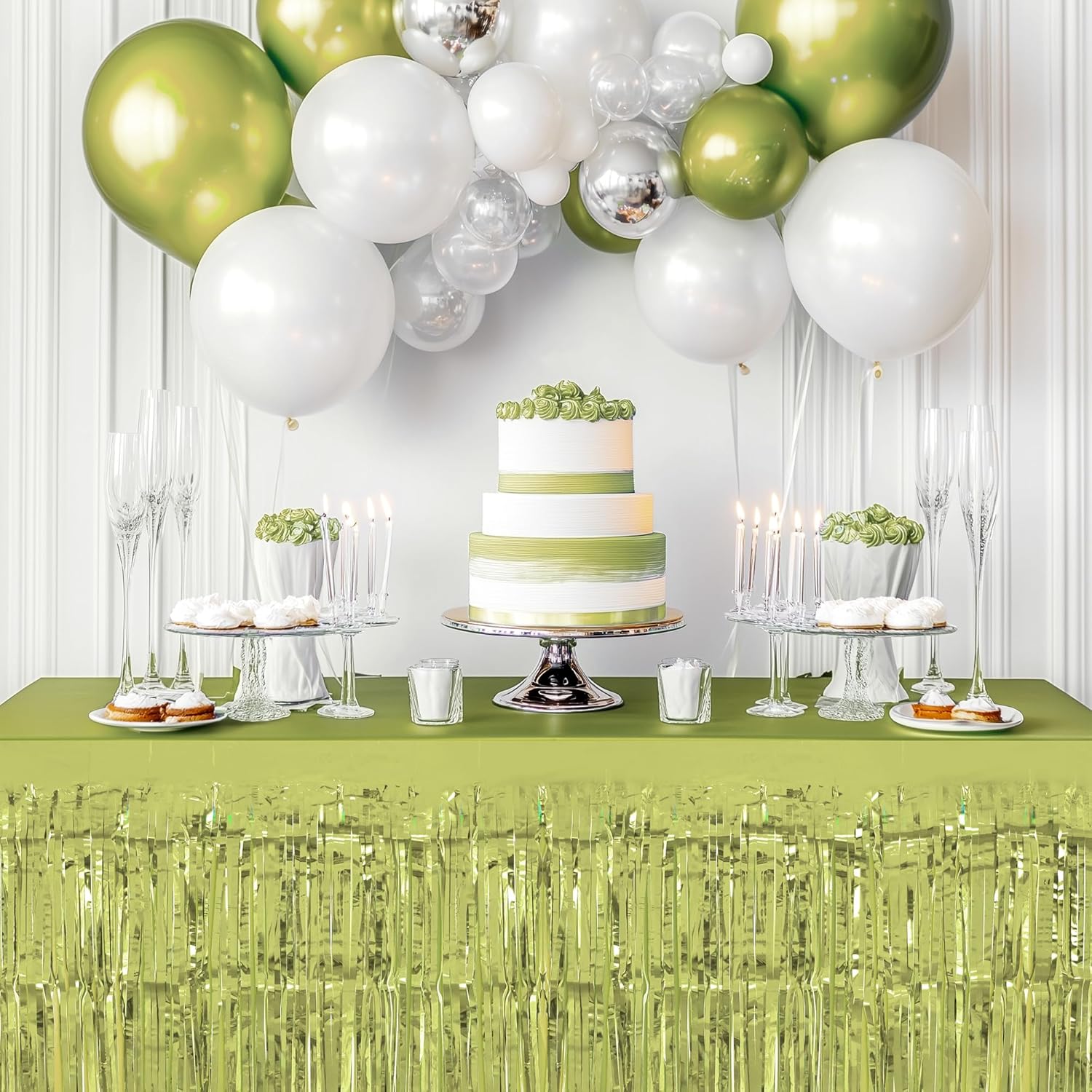 2 Pack Lime Green Table Skirts, 29x108" Metallic Foil Tinsel Fringe Table Skirt for Rectangle Tables Streamer Curtains Backdrop, Party Decorations for Birthdays, Weddings, Holidays