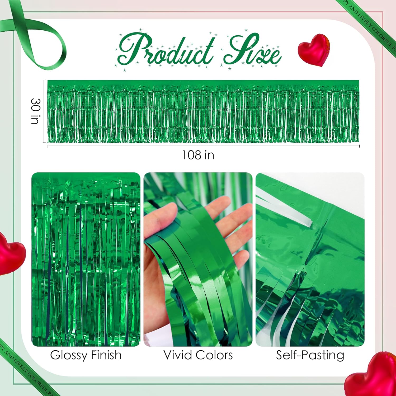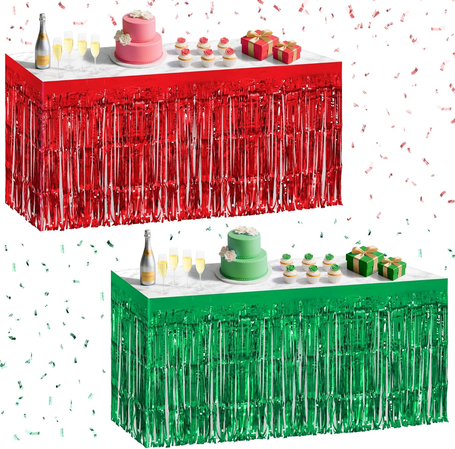 2 Pack Red Green Table Skirts, 29x108" Metallic Foil Tinsel Fringe Table Skirt for Rectangle Tables Streamer Curtains Backdrop, Party Decorations for Birthdays, Weddings, Holidays