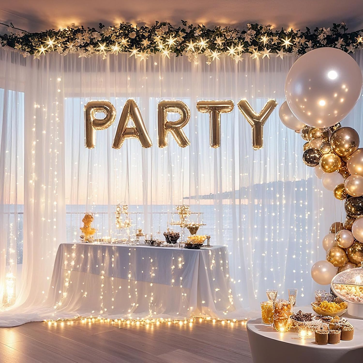 - 【10×10ft Tulle Backdrop Curtain with Lights】Create a dreamy and romantic atmosphere with our Tulle Backdrop Curtain with Lights. It features a 10x10 feet white sheer curtain paired with a 9.8 ft USB-powered warm white 300 LED string light set, complete with 10 transparent clips for easy installation, will surely make an excellent party backdrop once set up.
