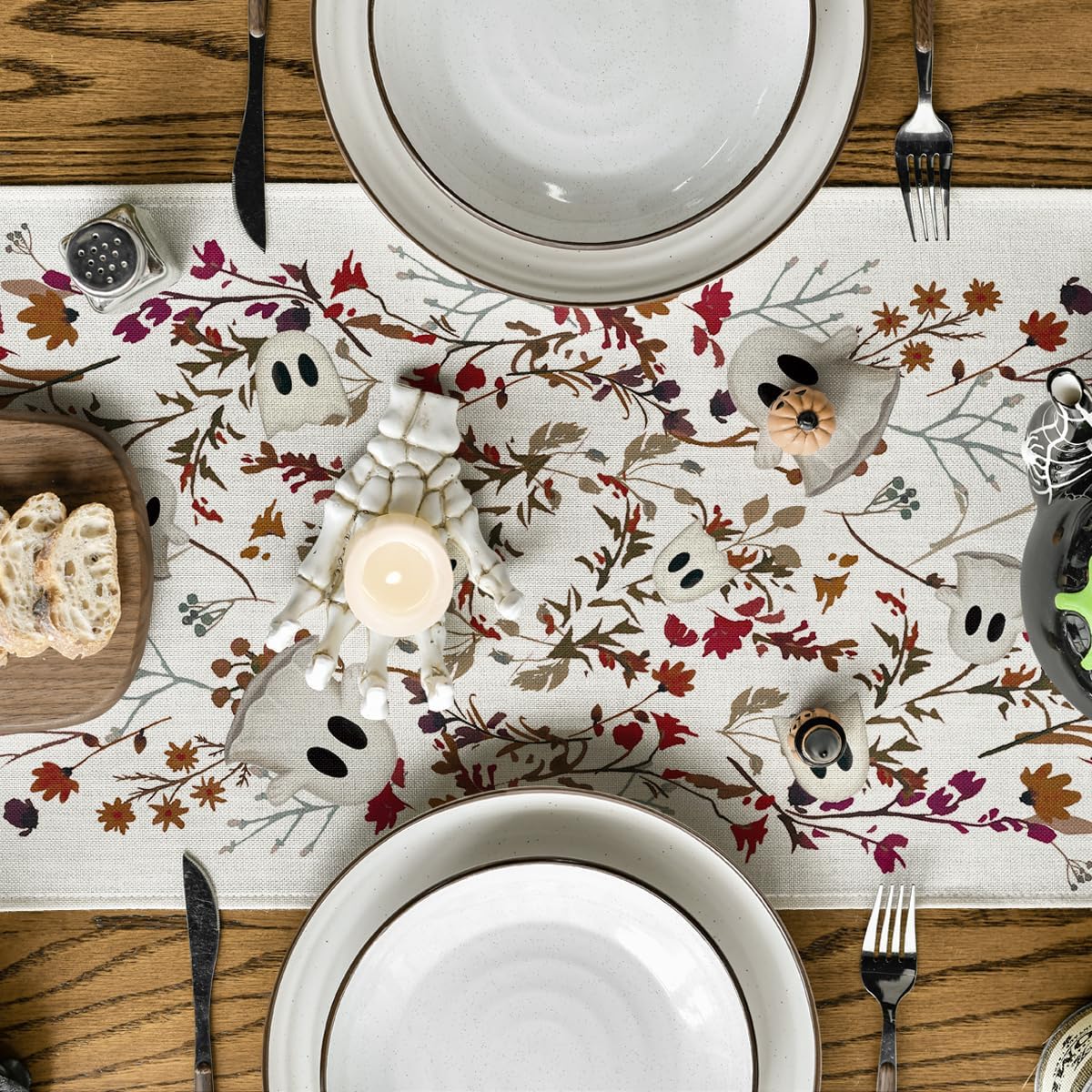 Artoid Mode Ghost Flowers Leaves 210 GSM Halloween Table Runner,Seasonal Fall Kitchen Dining Table Decoration for Home Party Decor 13x36 Inch