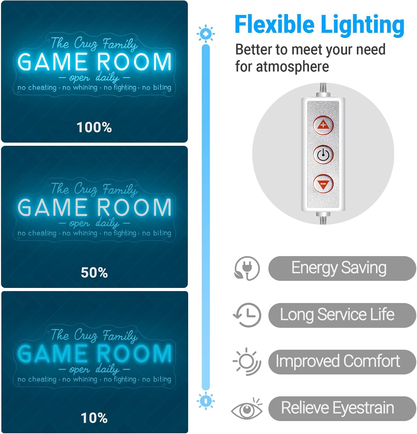 - 🎮【Personalized Game Room Signs】The personalized game room neon sign create a romantic, warm and stylish atmosphere for your playroom decor. Choose your favorite size and color, enter your custom text and so on and tailored to your decoration theme to create a truly belong you one-of-a-kind led sign. Click the "Customize Now" button to start!