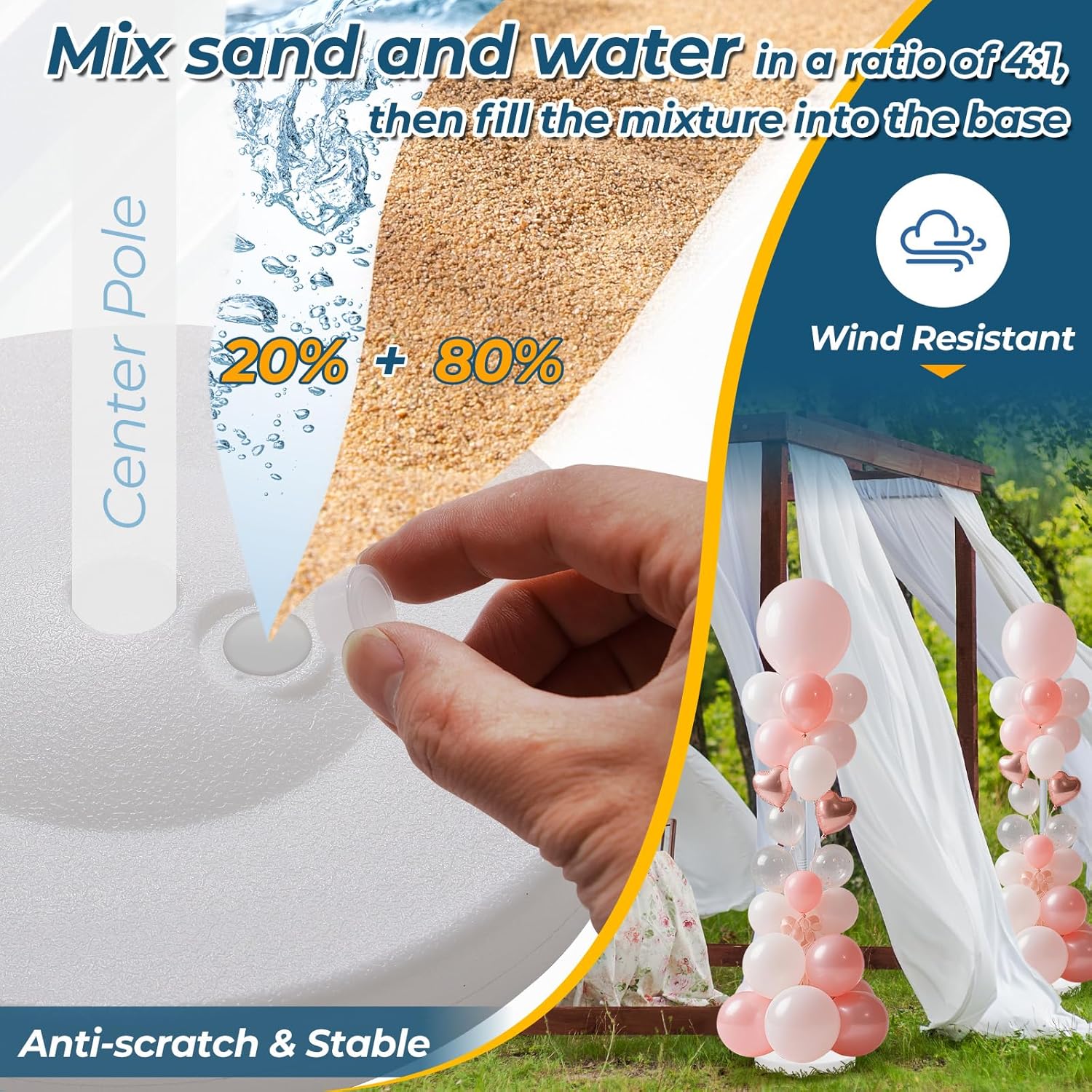 - ✅ Wind-Resistant Design: The balloon stand base is made of PVC material. Mix sand and water in a 4:1 ratio, then fill the mixture into the base to create a highly stable balloon stand.