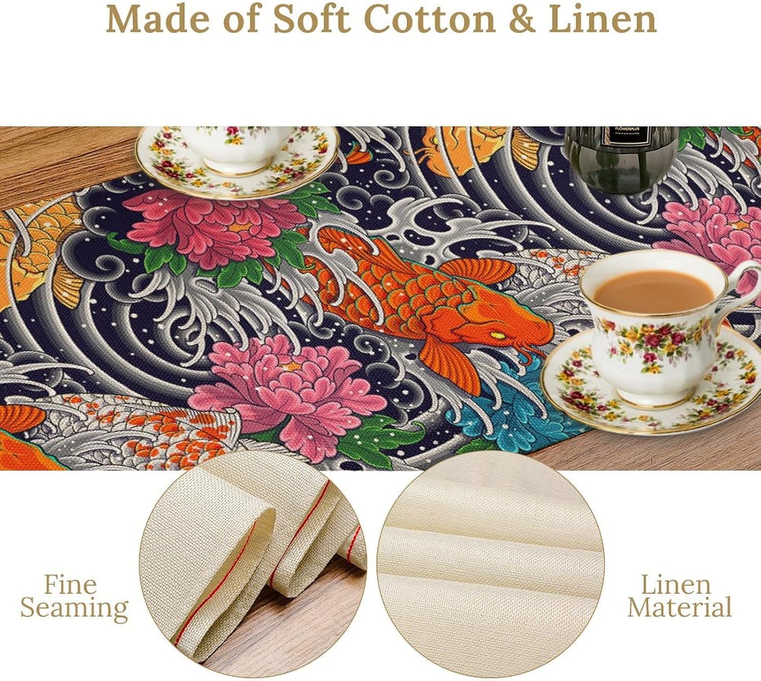 Japanese Retro Flowers Table Runner Oriental Tradition Kio Fish Art Printed Burlap Runner Home Kitchen Dining Table Living Room Decor Fabric 1 Panel W13xL108in