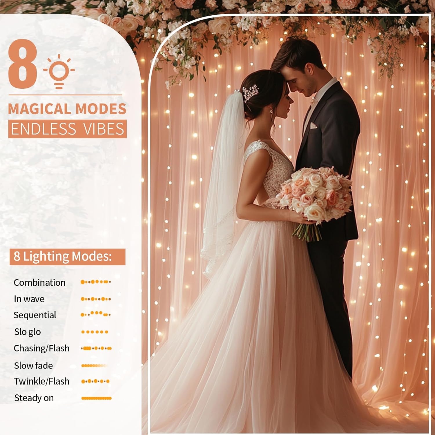 - Quick Setup in 3 Steps: 1. Hang curtains via rod pocket on any pipe/stand. 2. Attach lights using included clips before untying strands. 3. Plug USB into power bank/wall outlet – instant warm glow and choose from 8 lighting modes to create a romantic and magical atmosphere for any occasion! Tangle-free design saves 70% setup time