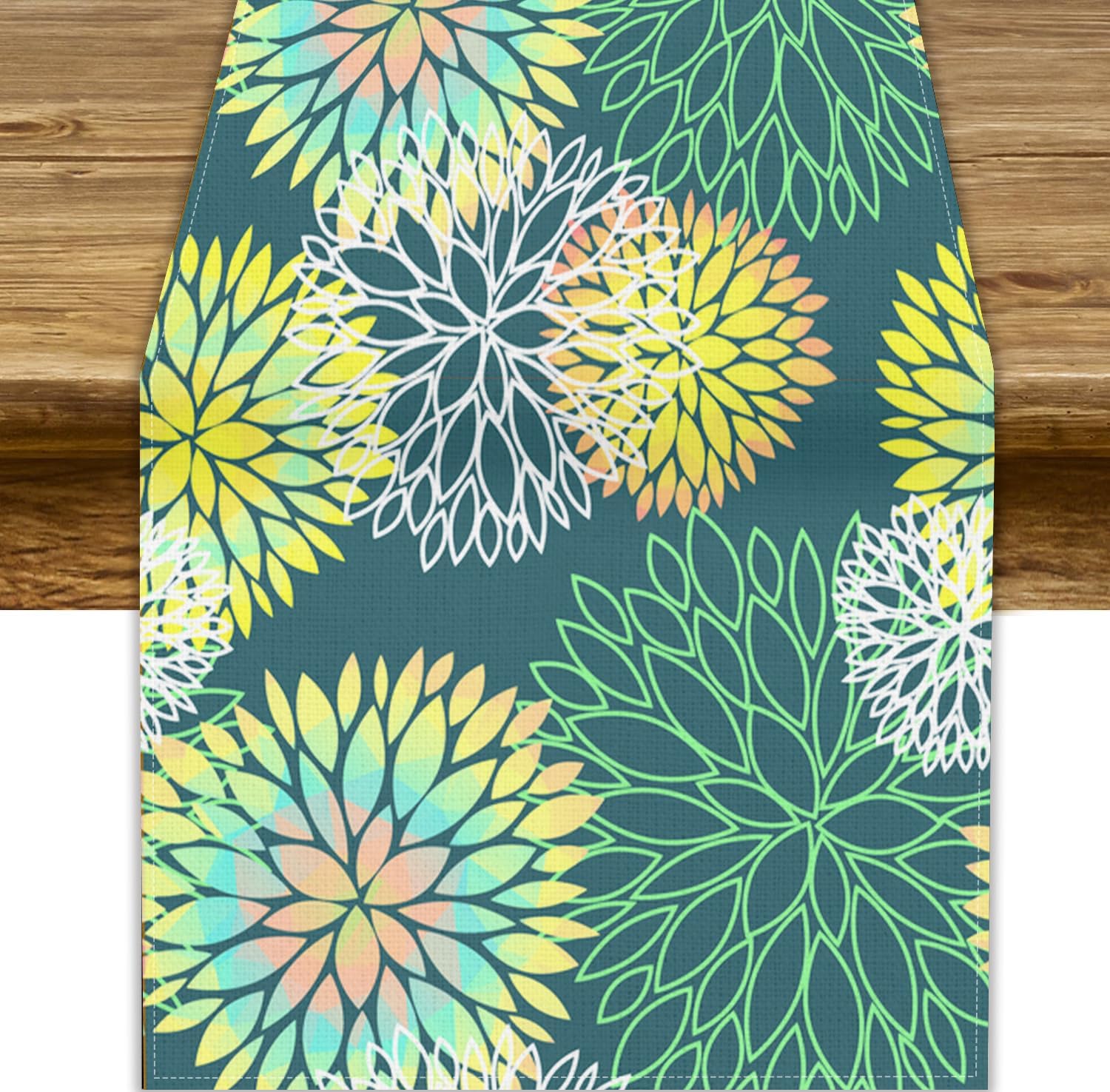 Green Dahlia Flower Table Runner, Linen Geometric Pattern Floral Table Decor Spring Farmhouse Decorations for Kitchen Dining Holiday Party Decor, 13x70 Inch