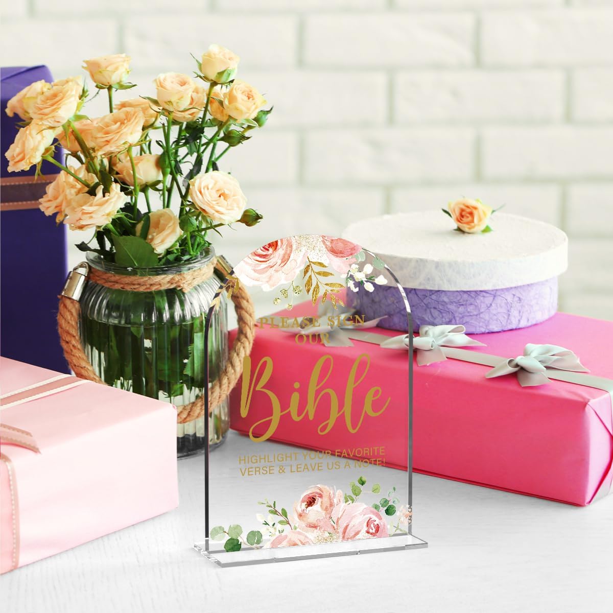 Acrylic Wedding Signs, Bridal Shower Decorations, Modern Calligraphy Arch Acrylic Table Top Sign for Wedding Reception and Engagement Parties - Please Sign Our Bible (Clear Pink Flowers)
