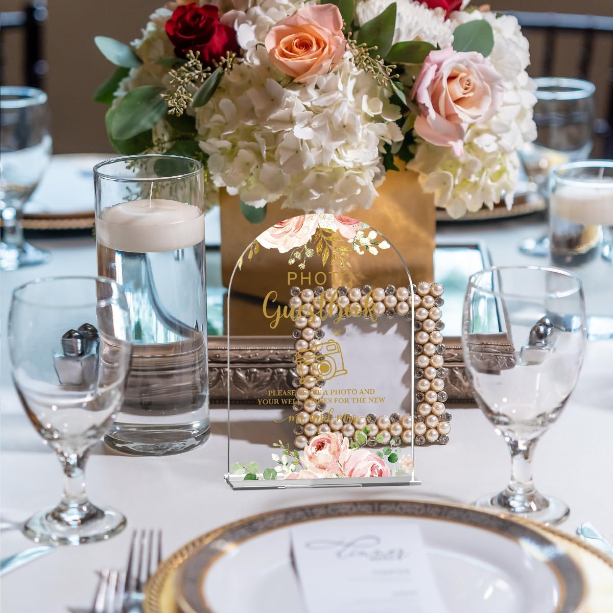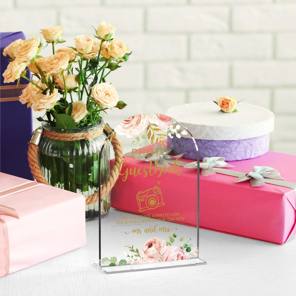 Acrylic Wedding Signs, Bridal Shower Decorations, Photo Guestbook Signs for Reception, Modern Calligraphy Arch Acrylic Table Top Sign for Wedding Reception and Engagement Parties (Clear Pink Flowers)