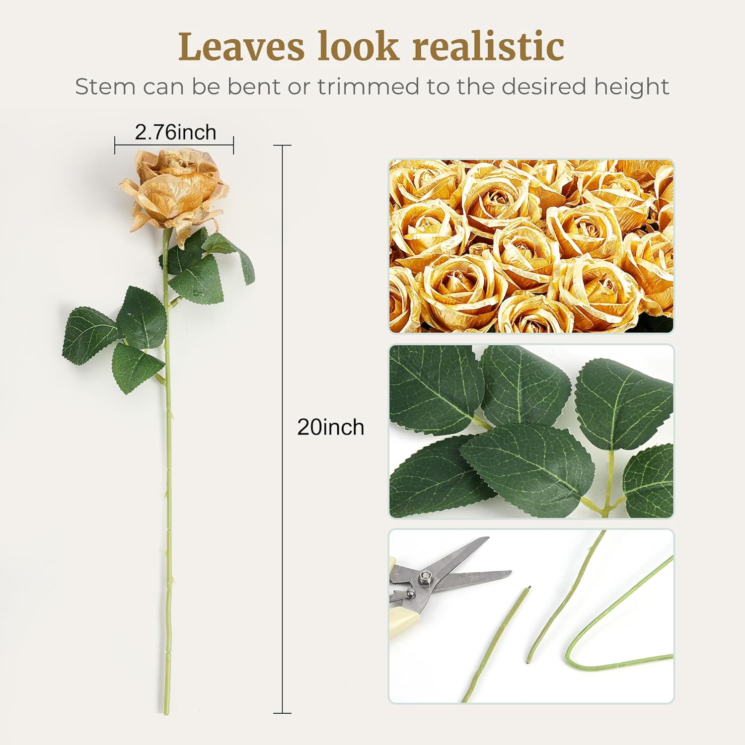 - Hyper-Realistic Golden Roses: Crafted from lustrous velvet and silk, these rose gold roses artificial flowers mimic natural petals with delicate textures and shimmering golden rose hues. Perfect for bridal shower bouquets or wedding cake decorations, their lifelike elegance enhances Valentine's Day gifts and anniversary scenes, fooling every eye