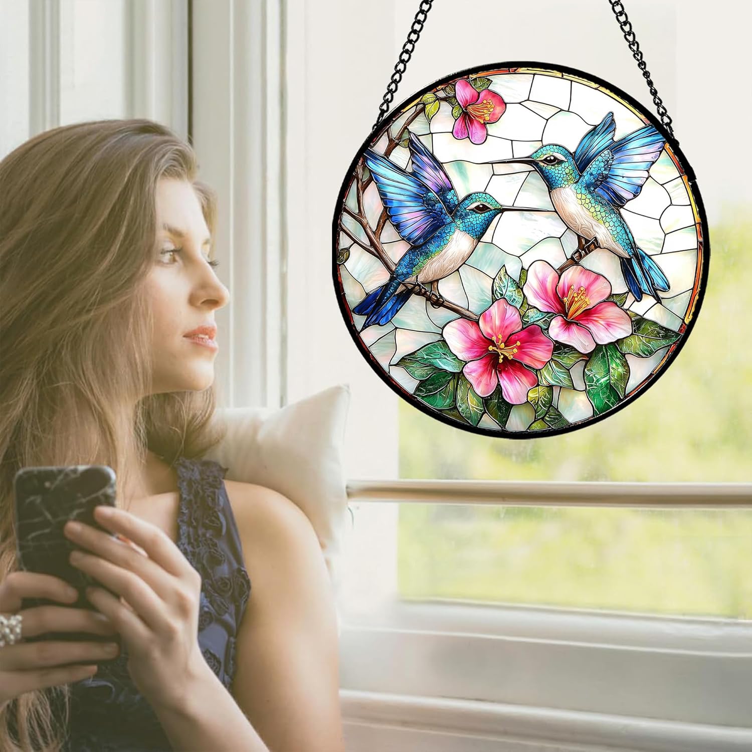 Stained Glass Window Hanging - Blue White Hummingbirds Pink Flowers Suncatcher for Door Terrace Garden Home Decor Bird Sun Catcher Birthday Gifts for Lovers Women Men Dad Mom Nana 15 in